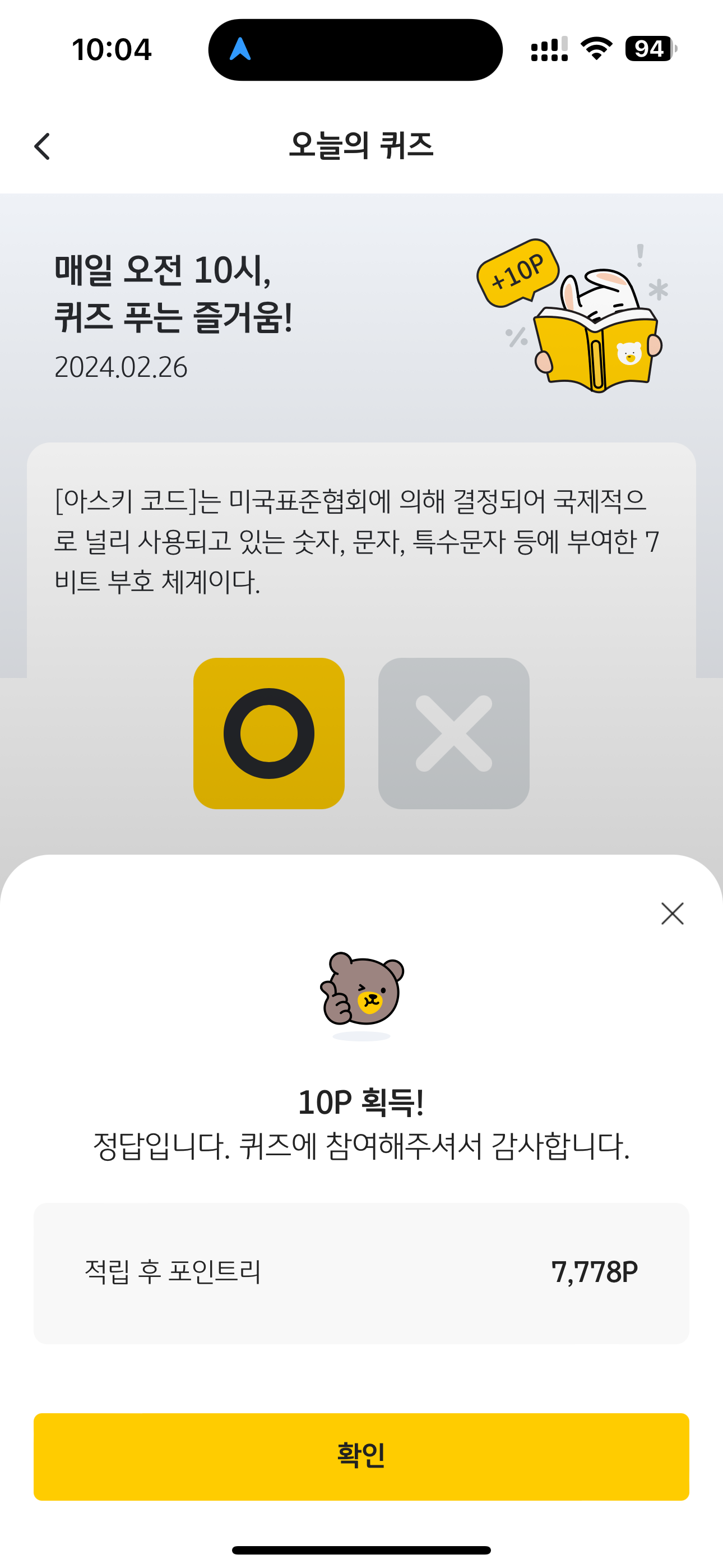 KB Pay 오늘의 퀴즈 2월 26일 정답(아스키 코드는 미국표준협회에 의해 결정되어 국제적으로 널리 사용되고 있는 숫자, 문자, 특수문자 등에 부여한 7비트 부호 체계이다)