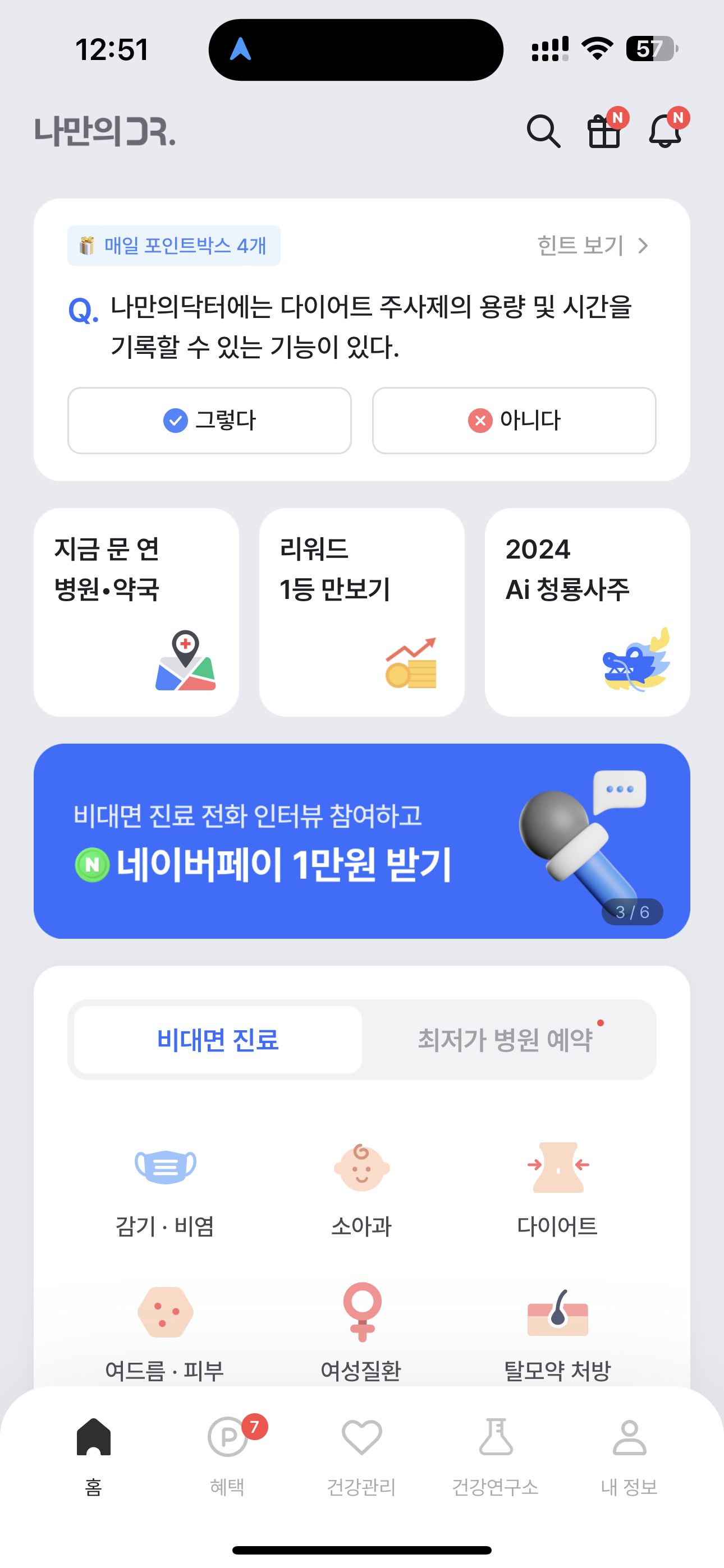 나만의닥터에는 다이어트 주사제의 용량 및 시간을 기록할 수 있는 기능이 있다. 그렇다, 아니다로 선택하시면 되는데요. 다이어트 주사제를 꾸준히 기록할 수 있게 지원하고 포인트도 주고 있으니 참고해 두세요