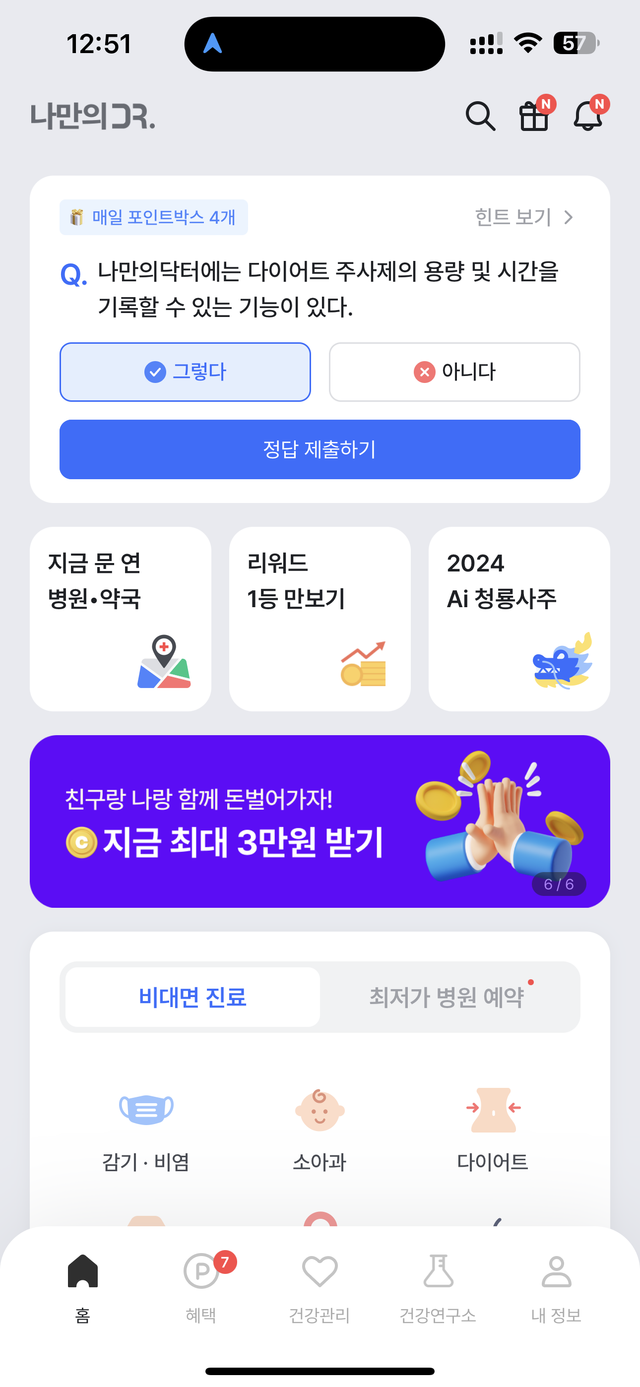나만의닥터 매일 돈 버는 건강퀴즈 정답은 그렇다 입니다