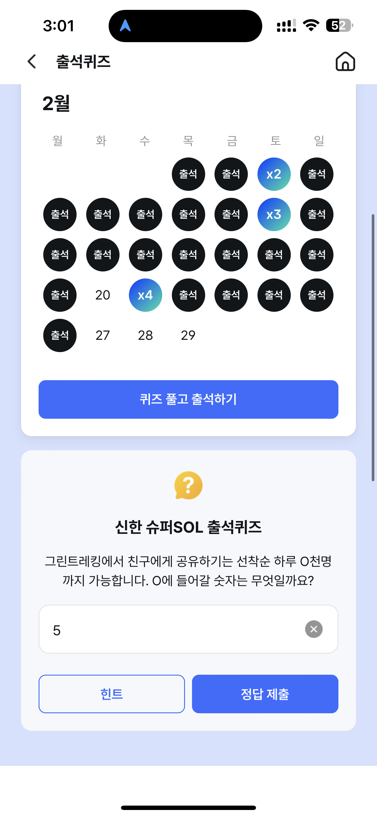 신한 슈퍼SOL 출석퀴즈 정답은 5 입니다
