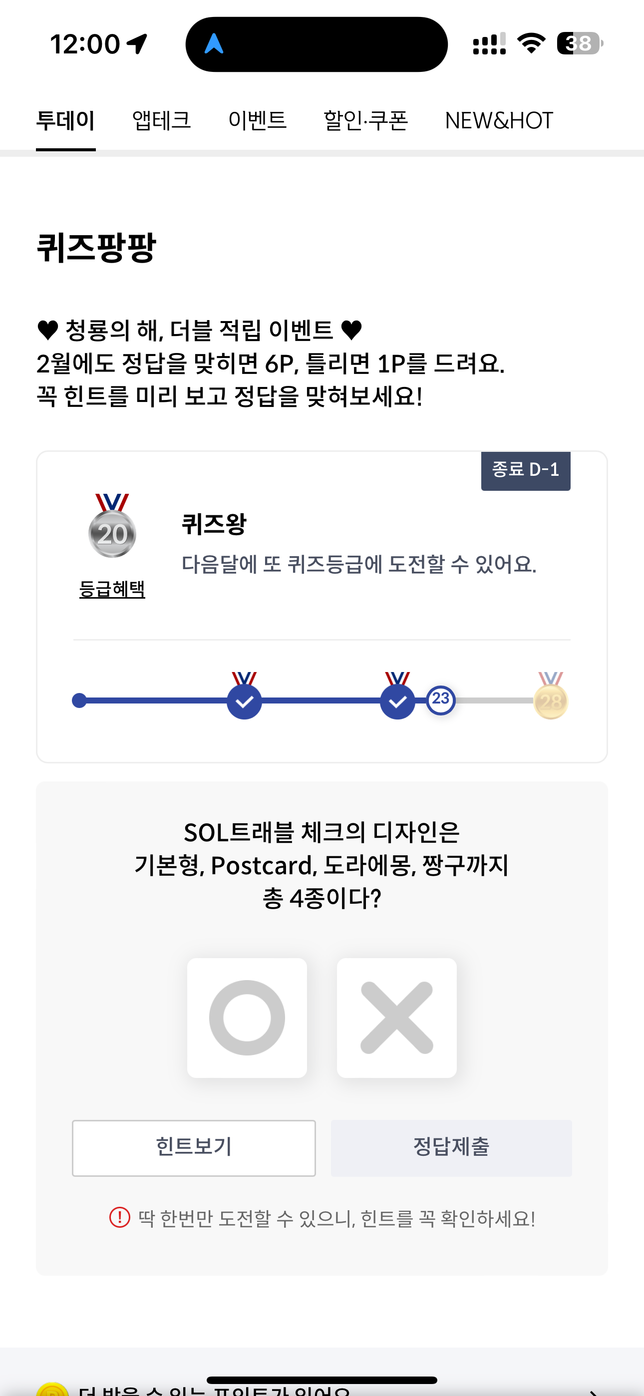 신한카드 퀴즈팡팡 2월 28일 정답(SOL트래블 체크의 디자인은 기본형, Postcard, 도라에몽, 짱구까지 총 4종이다?)
