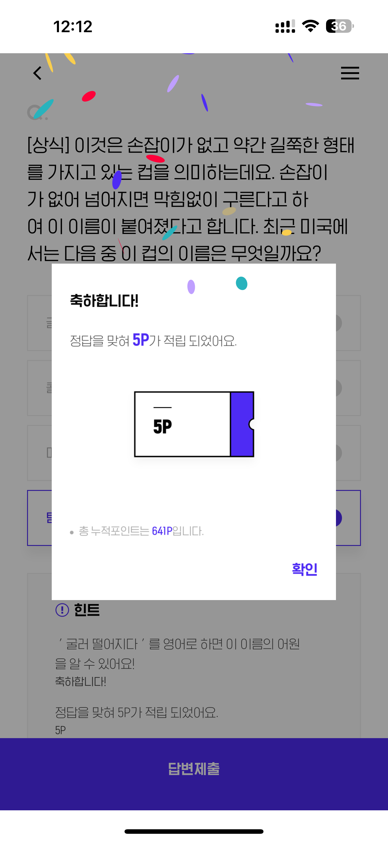 H포인트 퀴즈 2월 28일 정답(이것은 손잡이가 없고 약간 길쭉한 형태를 가지고 있는 컵을 의미하는데요. 손잡이가 없어 넘어지면 막힘없이 구른다고 하여 이 이름이 붙여졌다고 합니다.)
