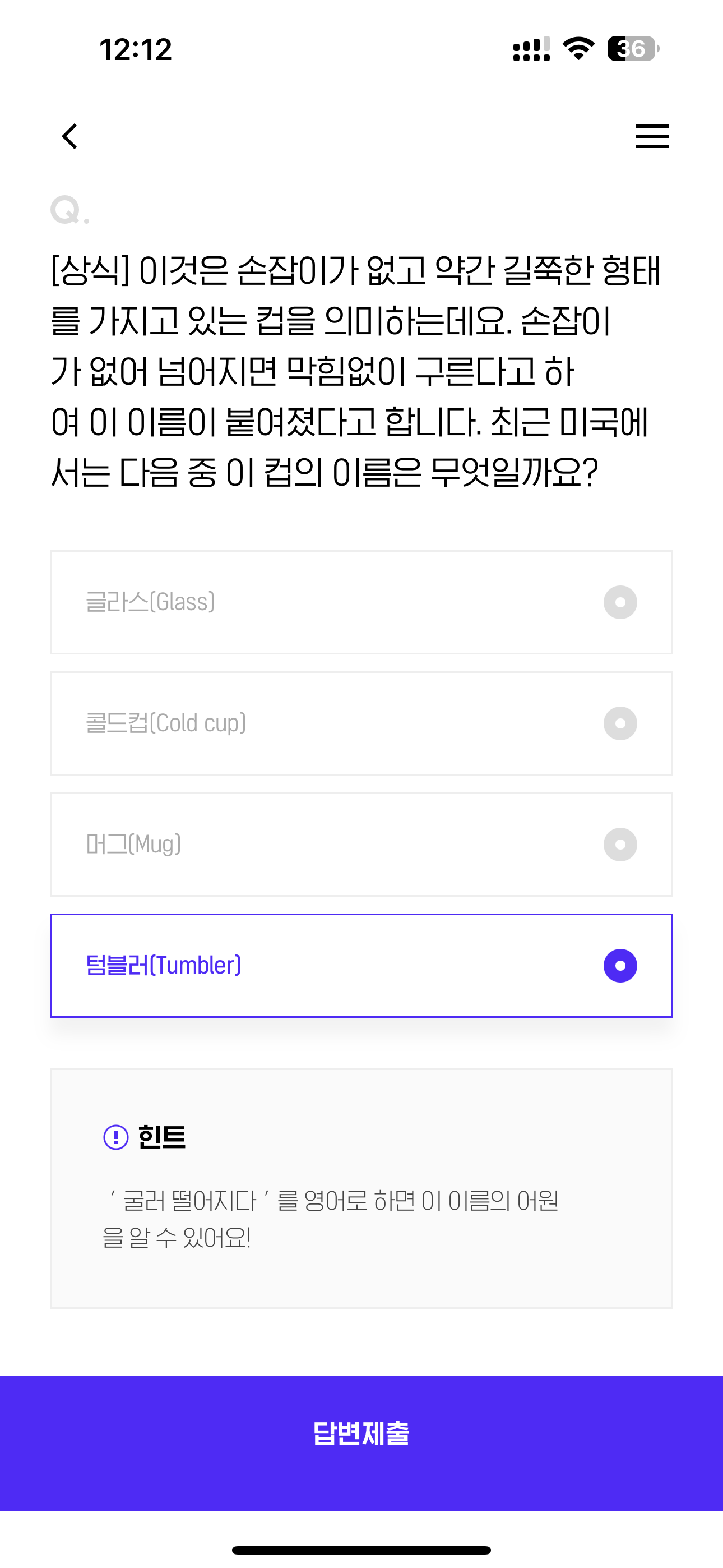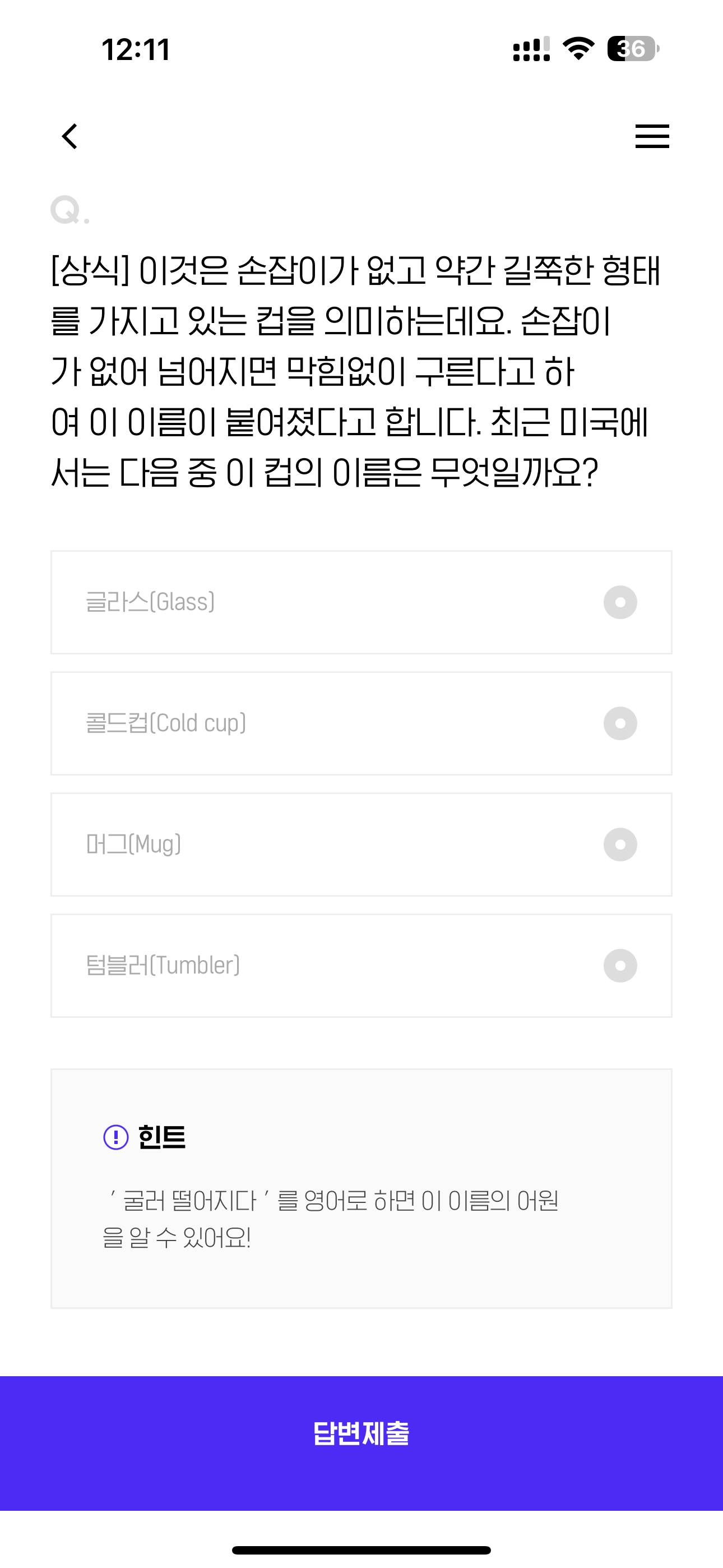 [상식] 이것은 손잡이가 없고 약간 길쭉한 형태를 가지고 있는 컵을 의미하는데요. 손잡이가 없어 넘어지면 막힘없이 구른다고 하여 이 이름이 붙여졌다고 합니다. 최근 미국에서는 다음 중 이 컵의 이름은 무엇일까요? 보기는 1. 글라스(Glass) 2. 콜드컵(Cold Cup) 3. 머그(Mug) 4. 텀블러(Tumbler)