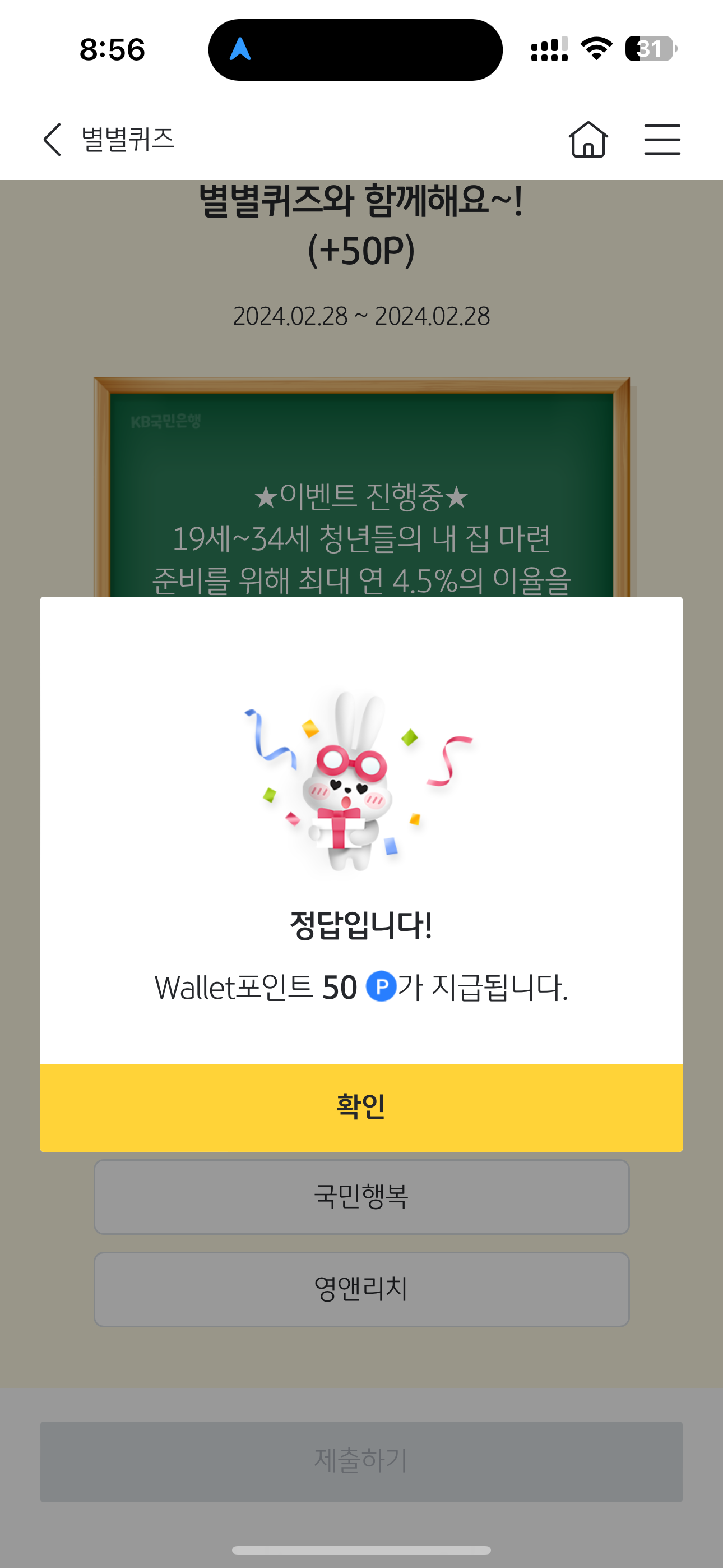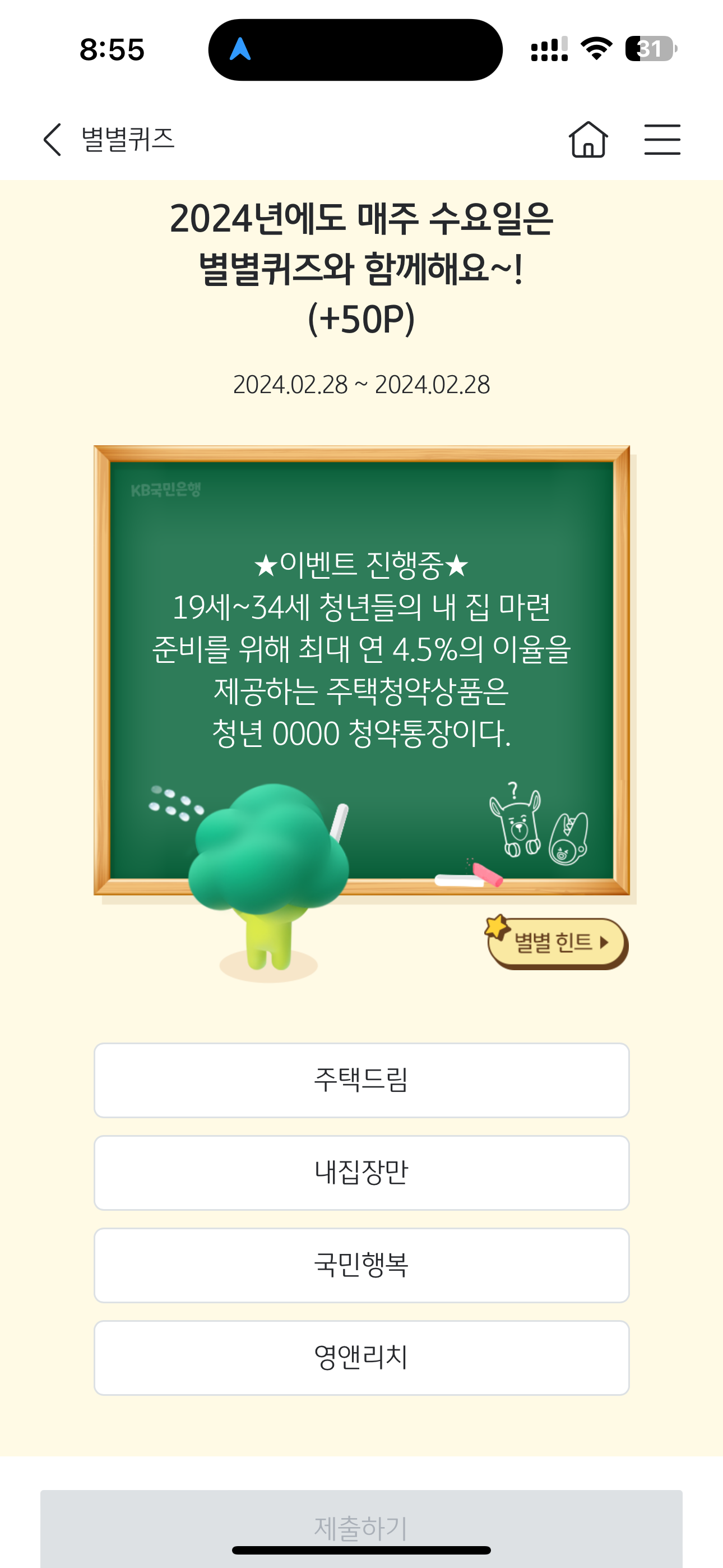 KB스타뱅킹 별별퀴즈 2월 28일 문제입니다