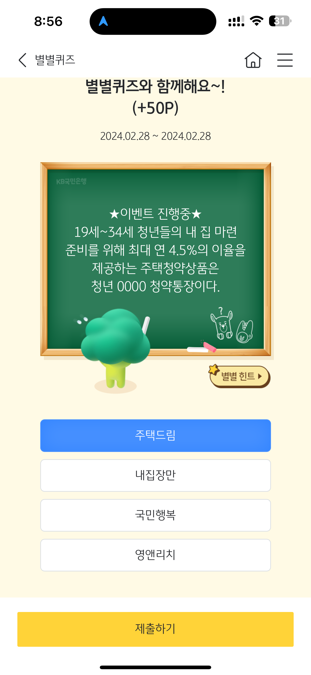 KB스타뱅킹 별별퀴즈 2월 28일 정답(19세~34세 청년들의 내 집 마련 준비를 위해 최대 연 4.5%의 이율을 제공하는 주택청약상품은 청년 0000 청약통장이다)