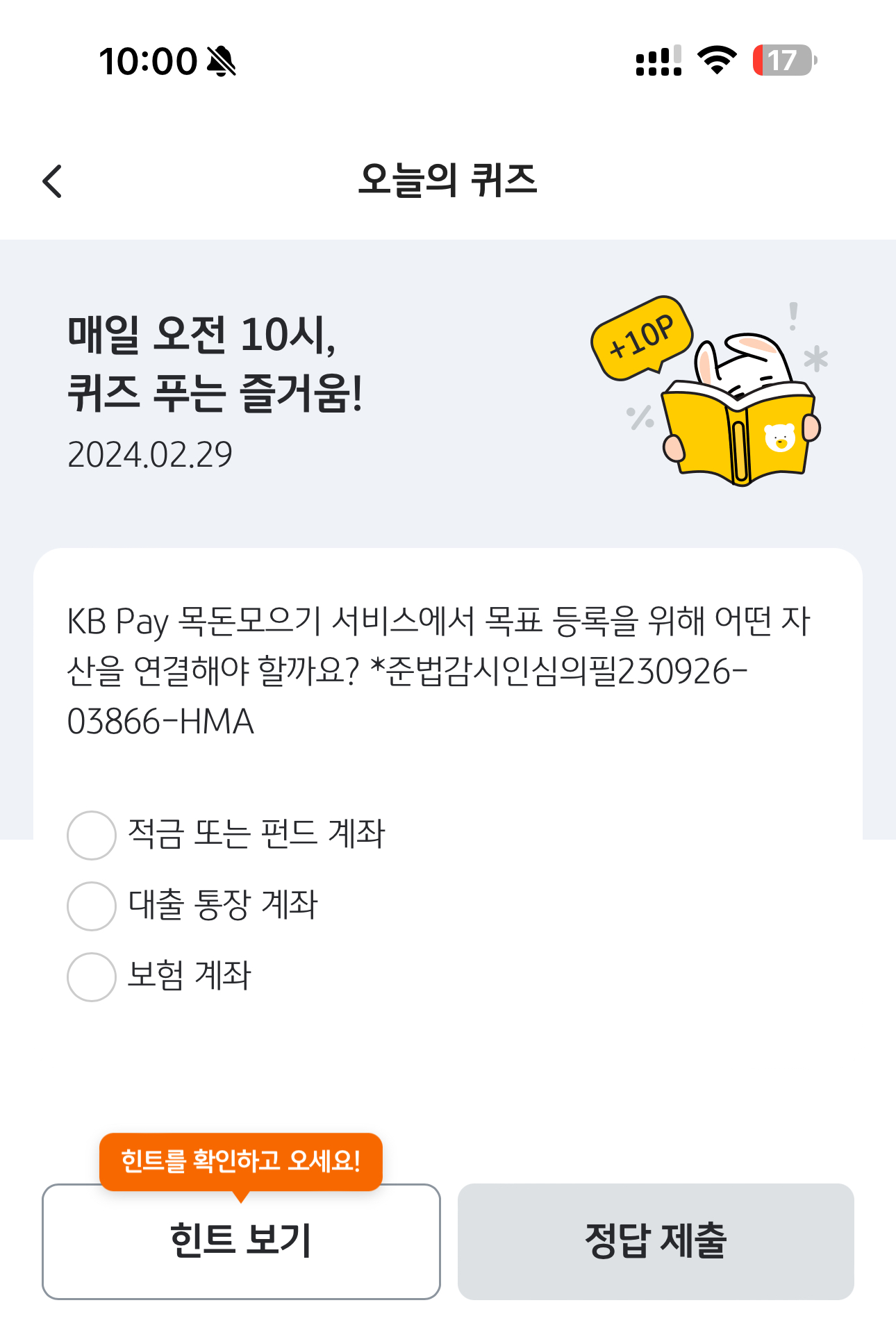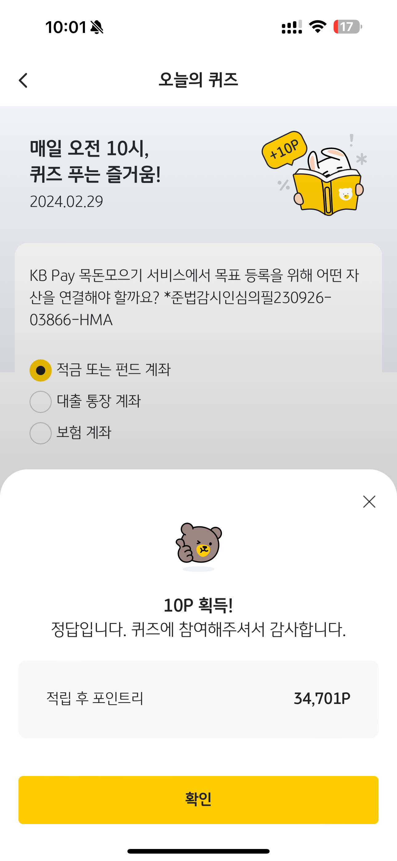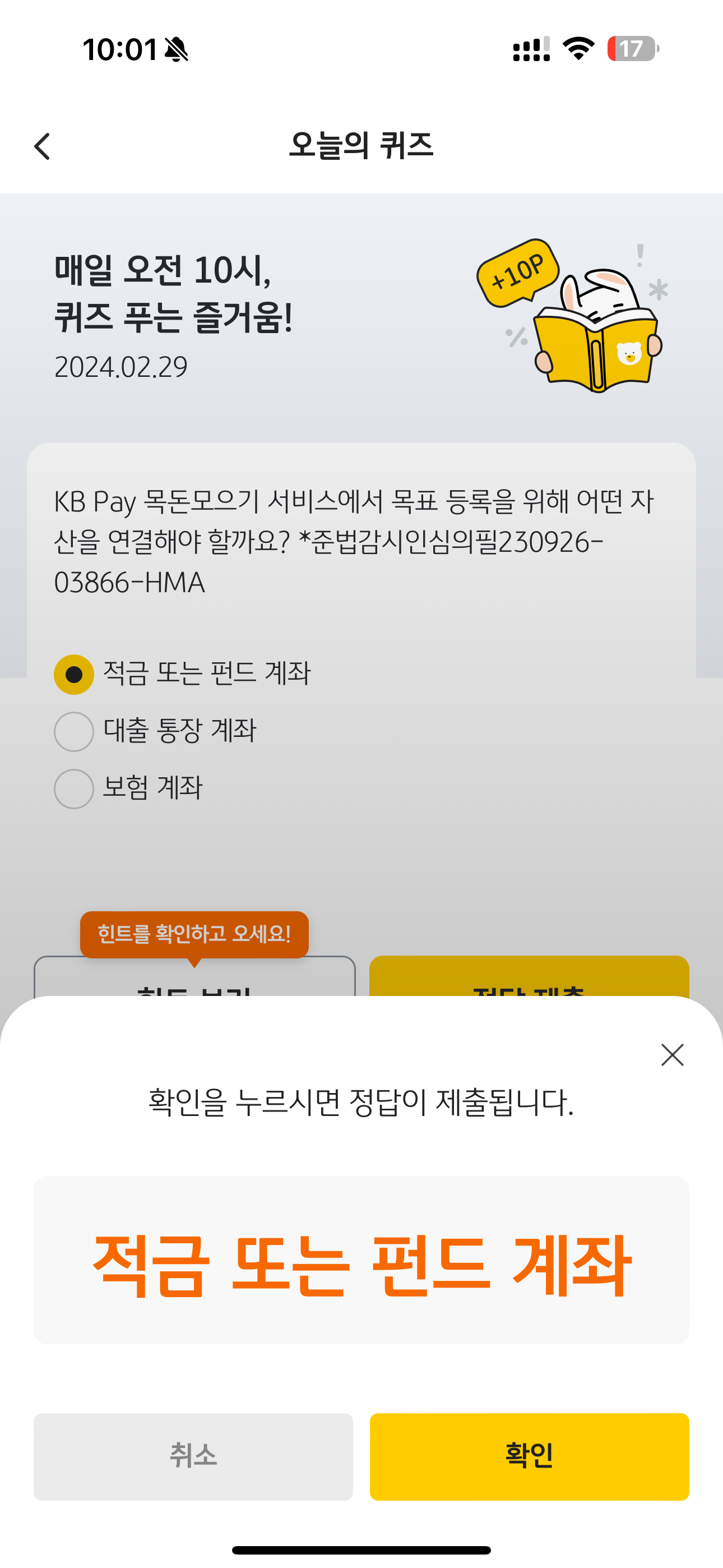 KB Pay 오늘의 퀴즈 정답은 적금 또는 펀드 계좌 입니다
