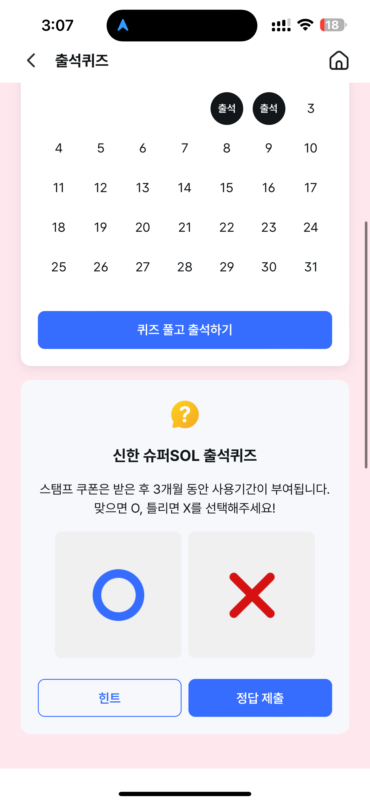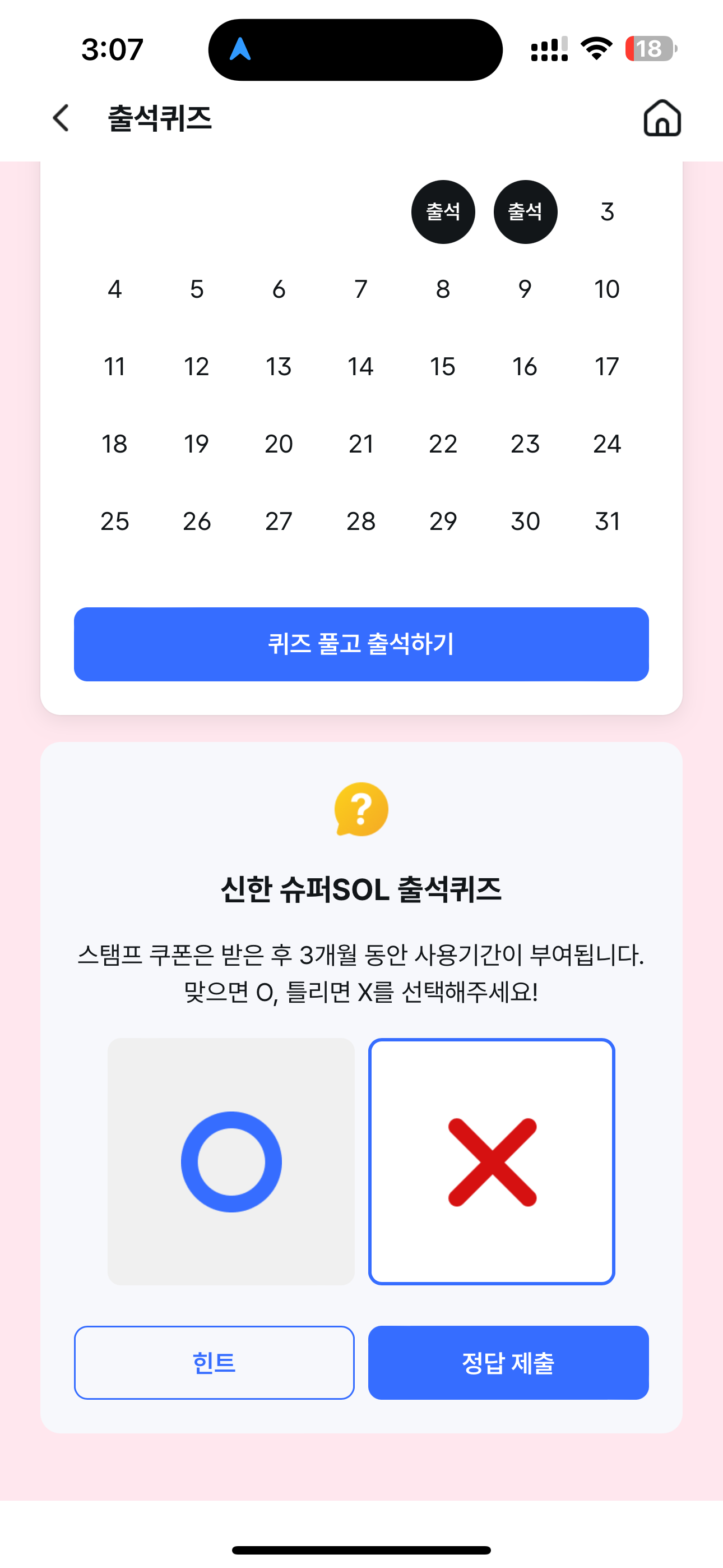 신한 슈퍼SOL 출석퀴즈 정답은 X 입니다