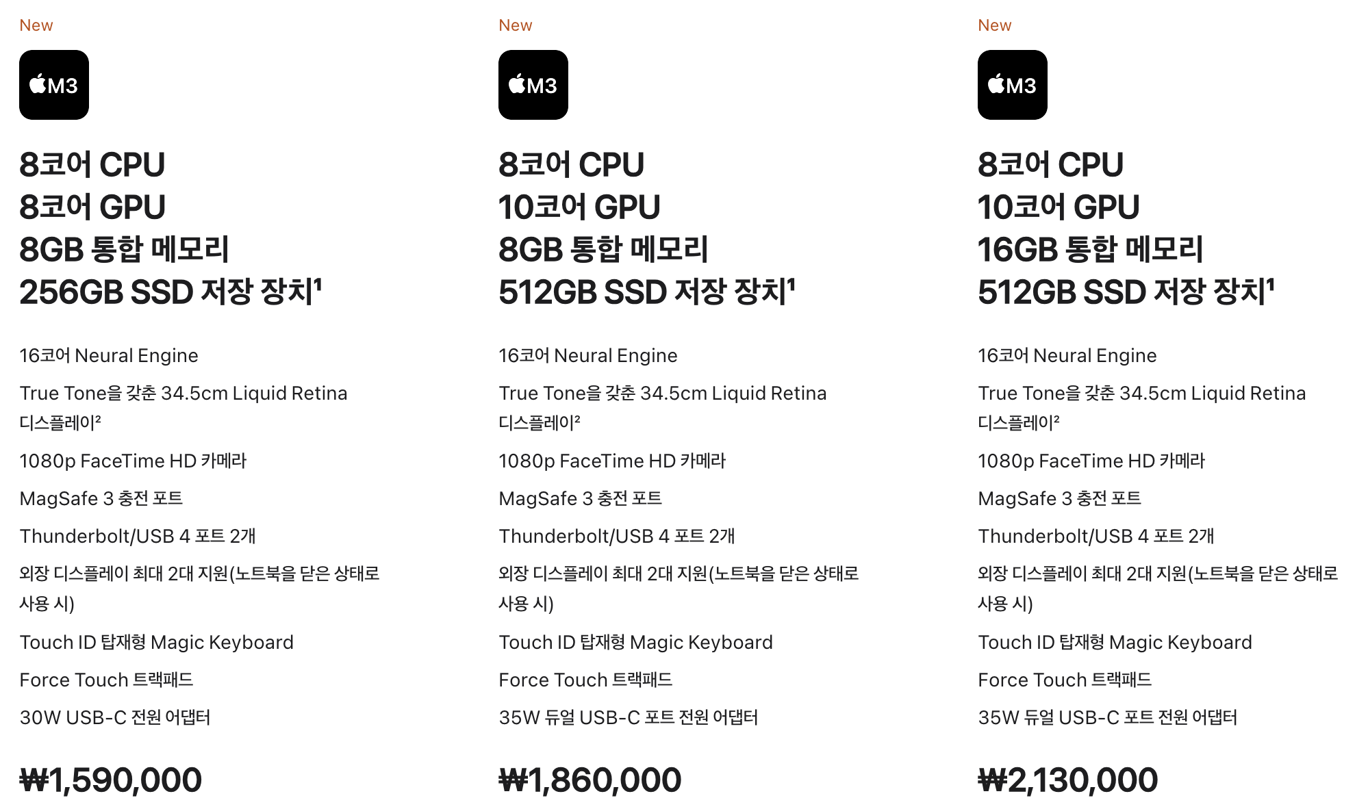 애플 M3 맥북에어13 가격은 1,590,000원부터 시작하고 교육용은 1,450,000원부터 시작합니다.