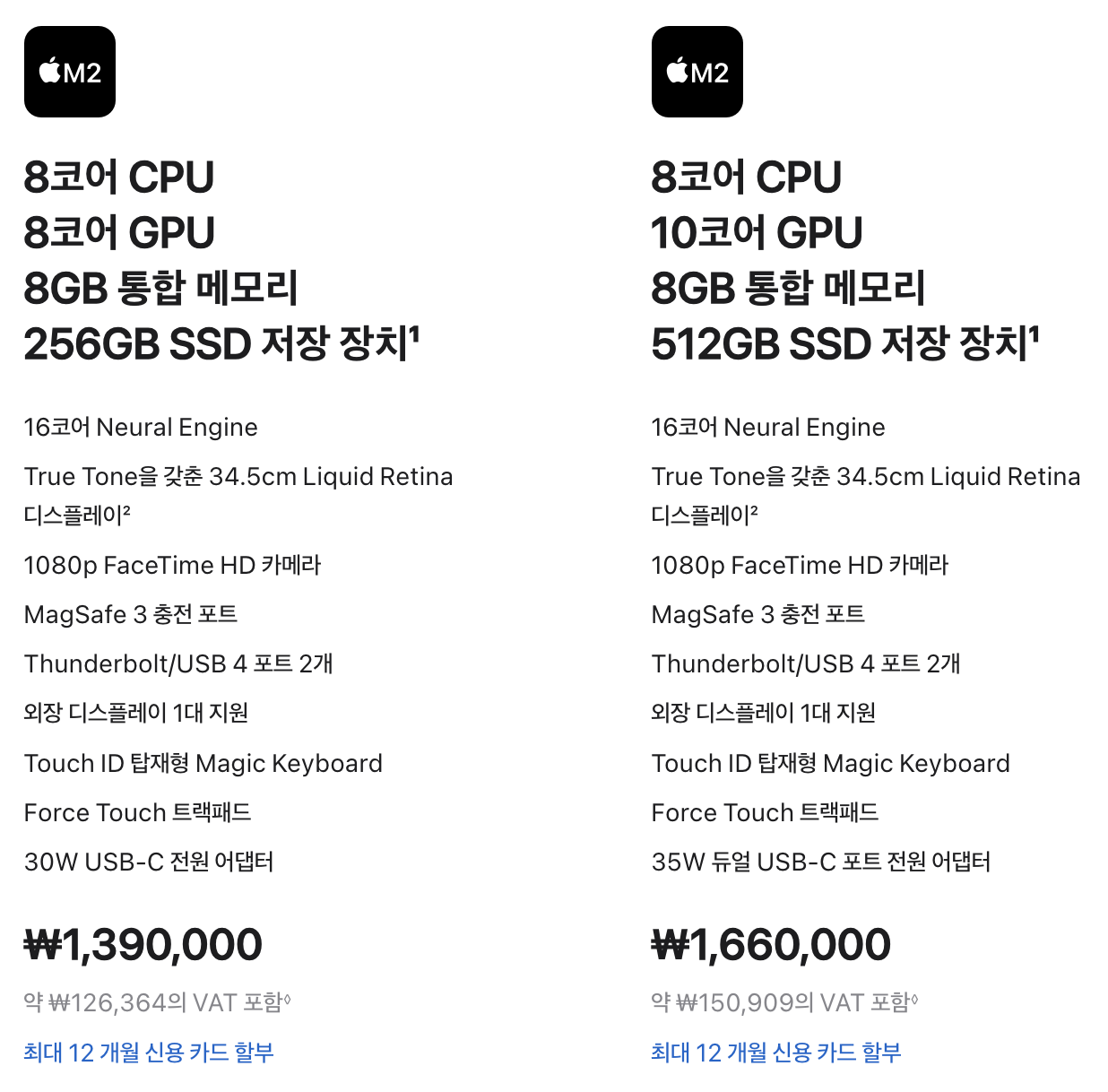 애플 M2 맥북에어13은 가격이 하락해 1,390,000원부터 시작하고 교육용은 1,250,000원부터 시작합니다.