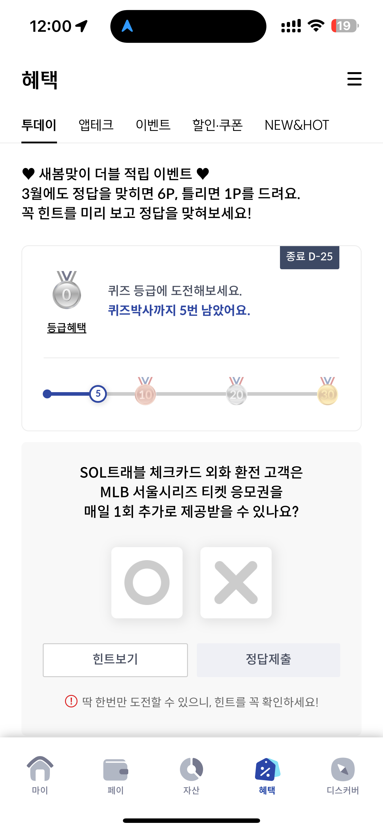 SOL트래블 체크카드 외화 환전 고객은 MLB 서울시리즈 티켓 응모권을 매일 1회 추가로 제공받을 수 있나요? O, X 퀴즈인데요. MLB서울시리즈는 전세계의 관심을 받는 행사입니다. 우리나라에서 메이저리그를 볼 수 있는 특별한 경험인데요. 이런 이벤트를 잘 활용해 보시면 좋을 것 같습니다