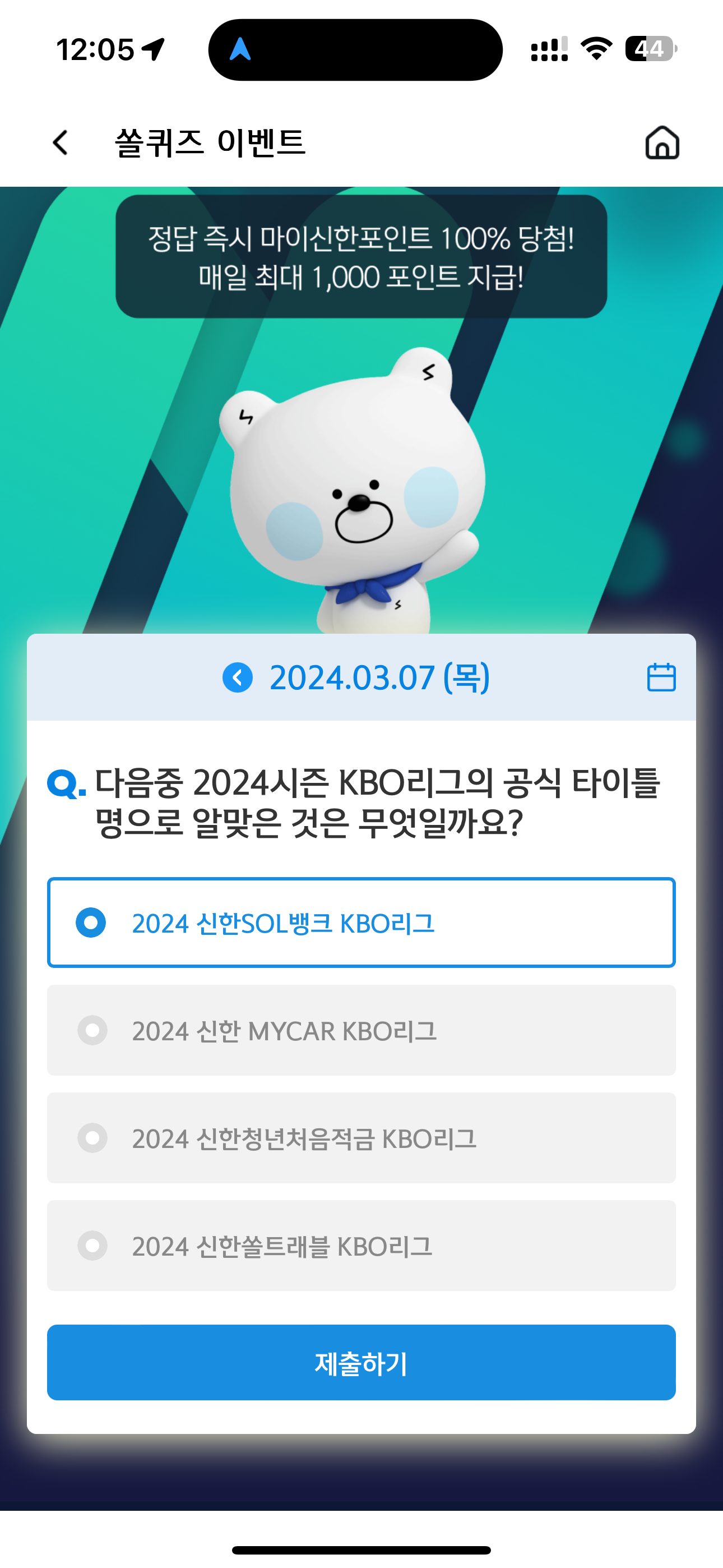 신한 슈퍼SOL 야구/상식 쏠퀴즈 정답은 2024 신한SOL뱅크 KBO리그 입니다