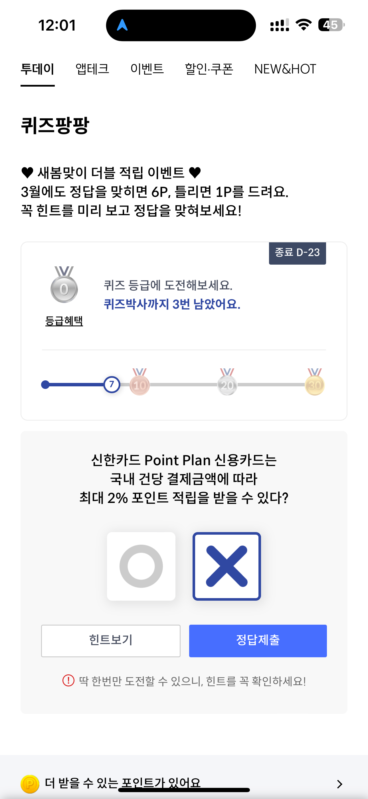 신한카드 퀴즈팡팡 정답은 X 입니다