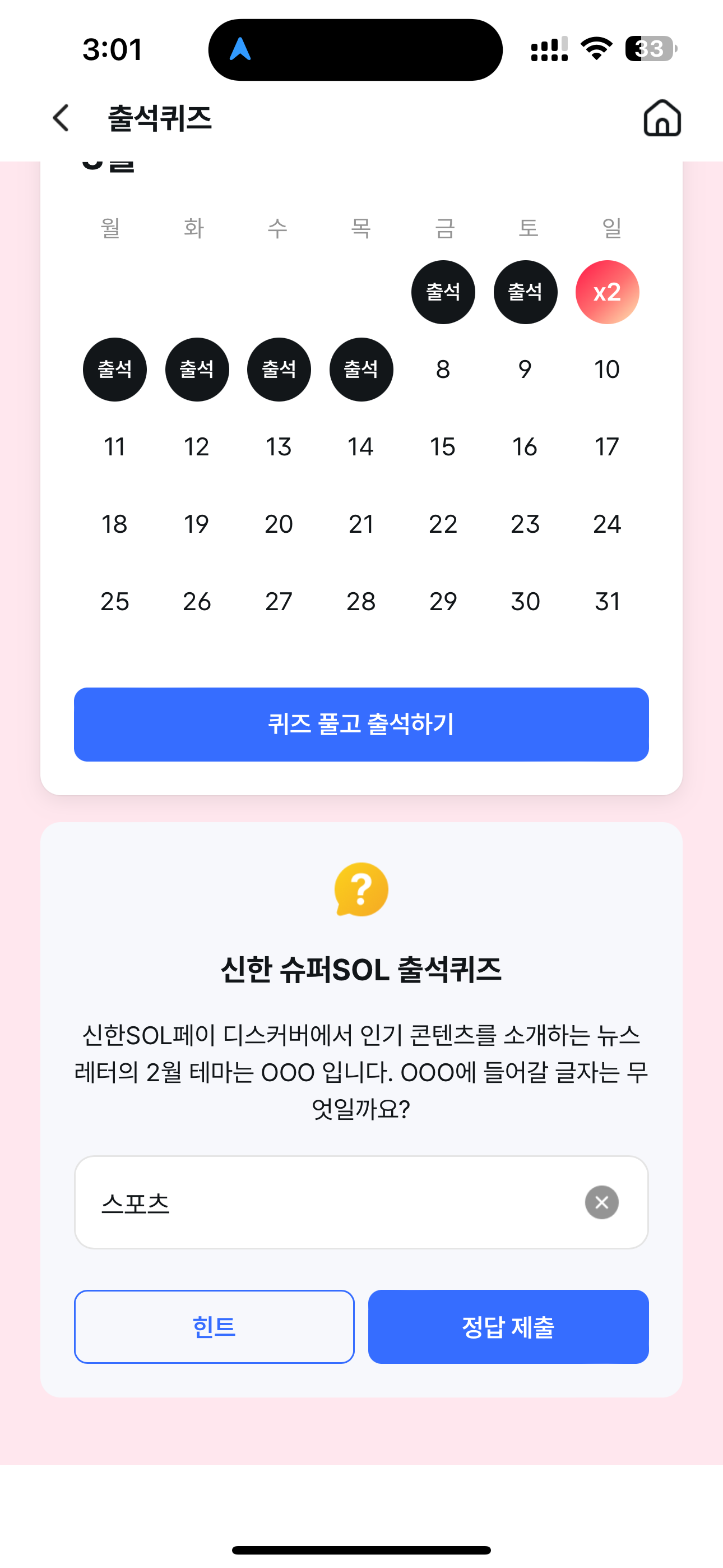 신한 슈퍼SOL 출석퀴즈 정답은 스포츠 입니다