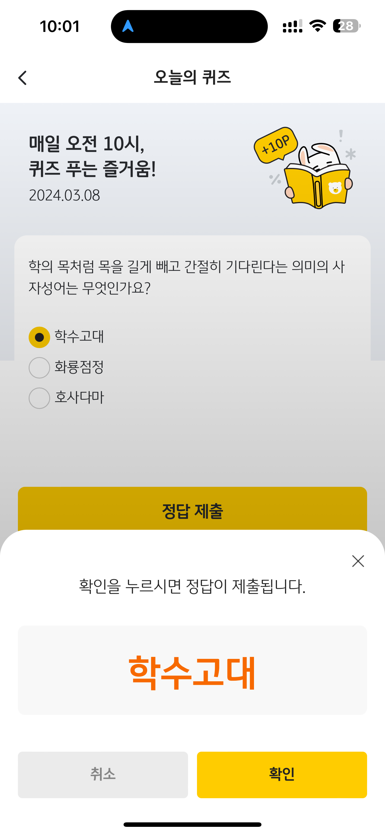 KB Pay 오늘의 퀴즈 정답은 학수고대 입니다
