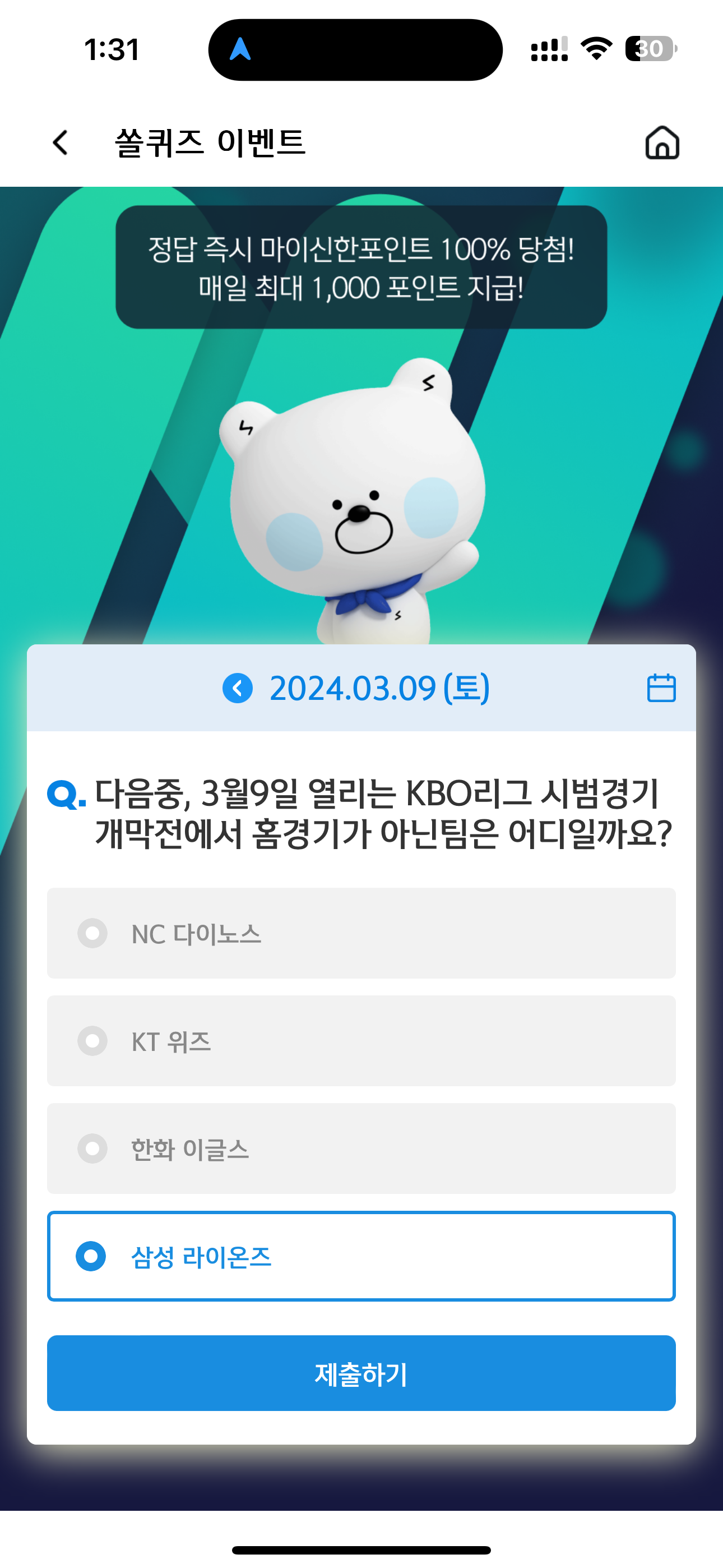 신한 슈퍼SOL 야구/상식 쏠퀴즈 3월 9일 문제입니다