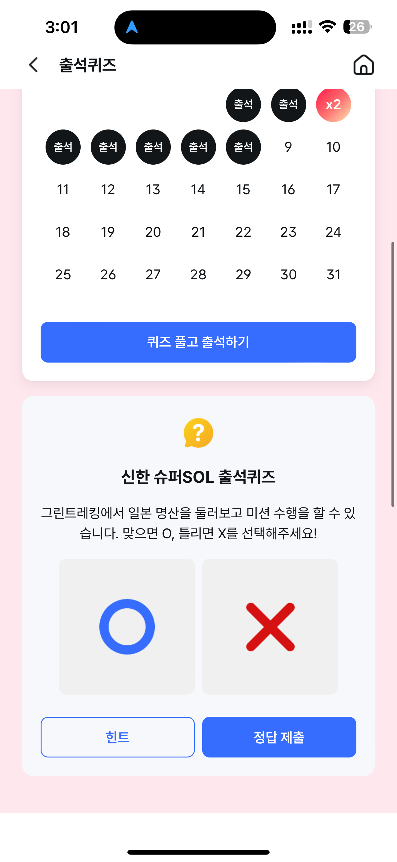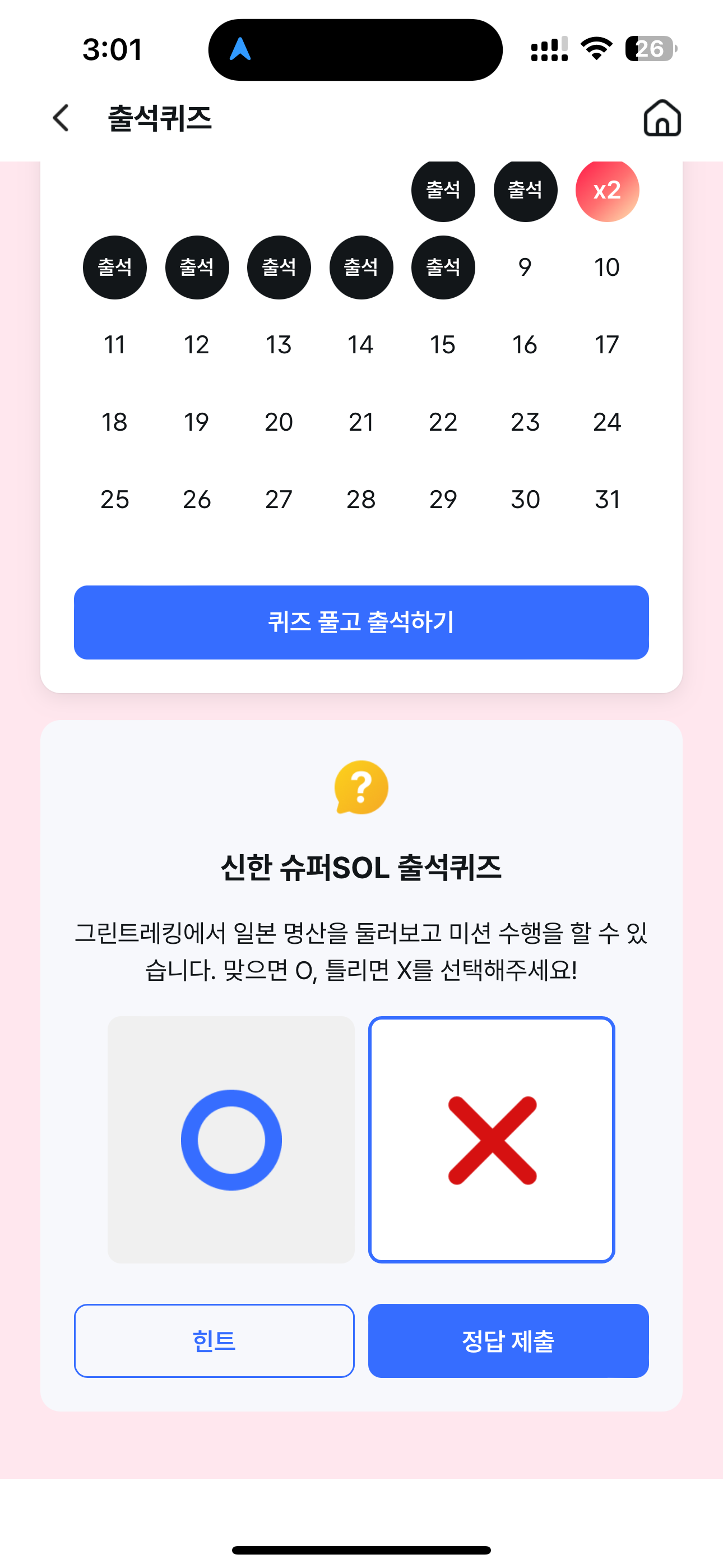 신한 슈퍼SOL 출석퀴즈 정답은 X 입니다