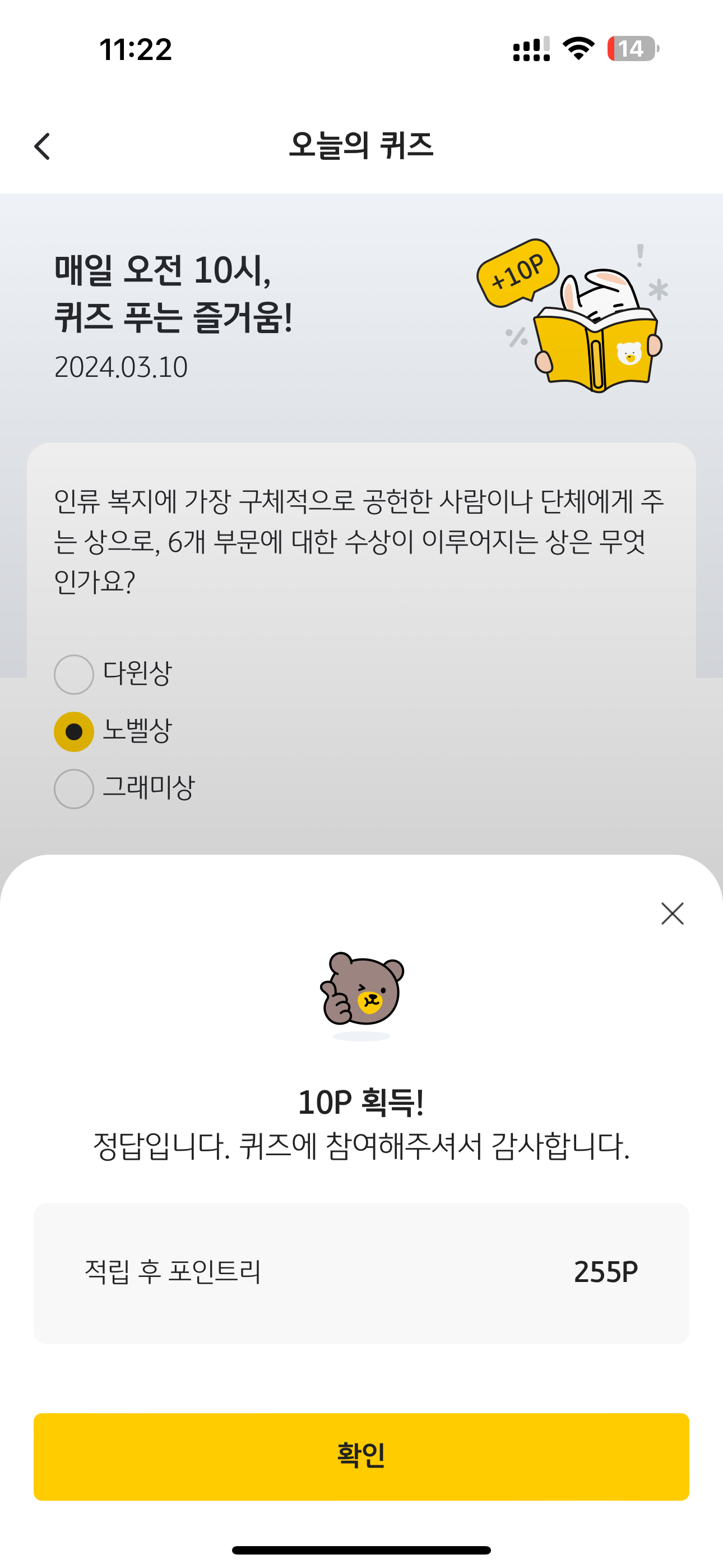 KB Pay 오늘의 퀴즈 정답은 노벨상 입니다