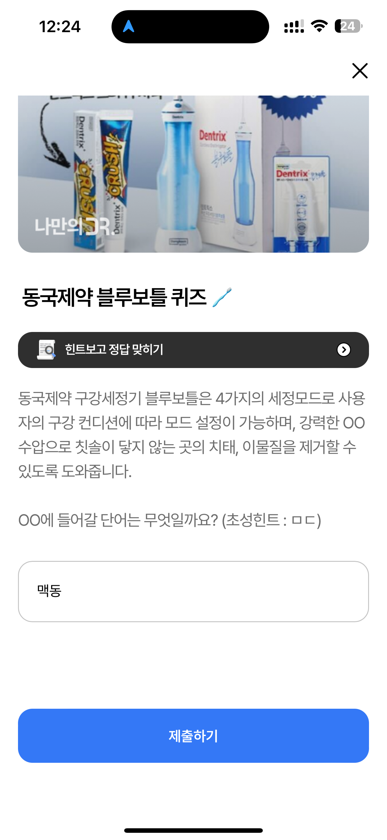 나만의닥터 퀴즈 3월 11일 동국제약 블루보틀 퀴즈 정답은 맥동 입니다