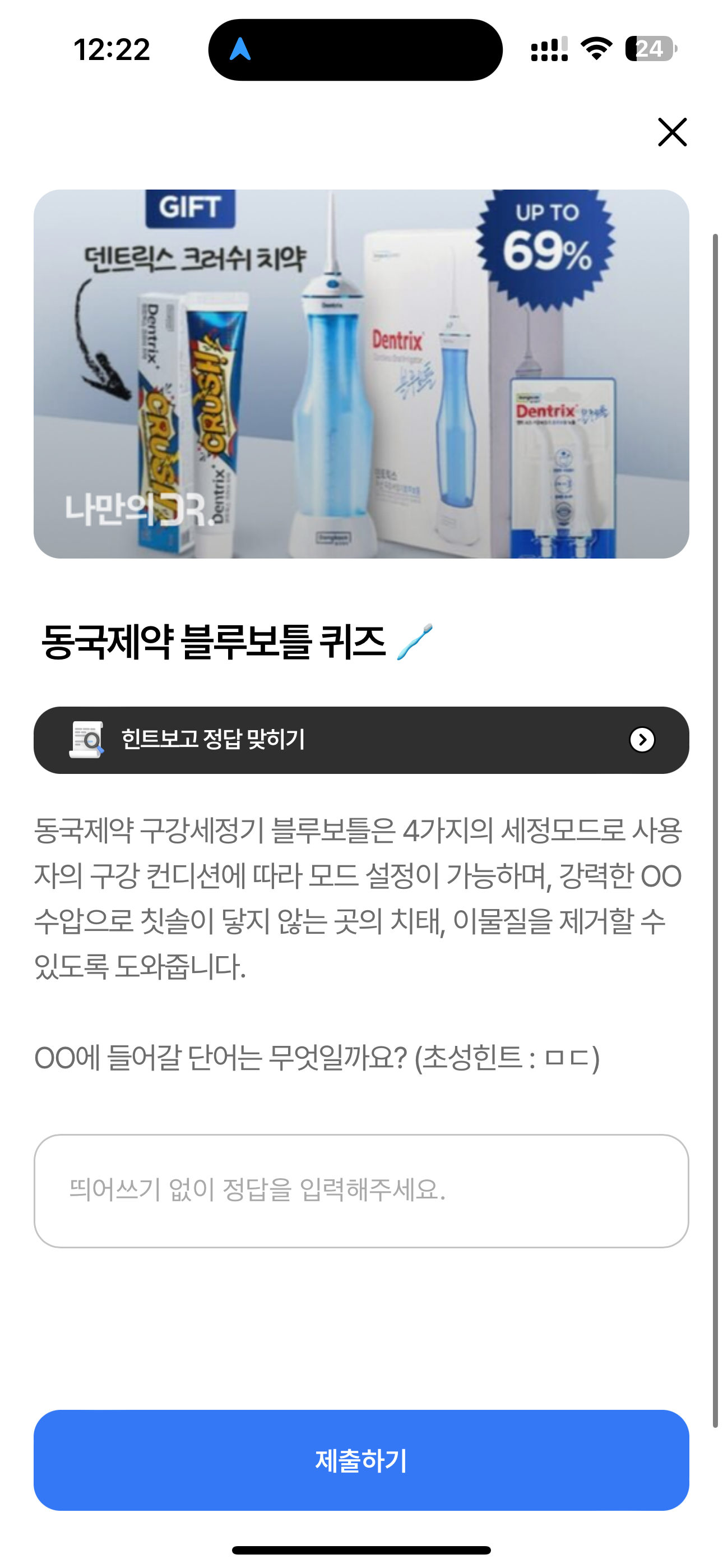 둥국제약 구강세정기 블루보틀은 4가지의 세정모드로 사용자의 구강 컨디션에 따라 모드 설정이 가능하며, 강력한 OO수압으로 칫솔이 닿지 않는 곳의 치태, 이물질을 제거할 수 있도록 도와줍니다. OO에 들어갈 단어는 무엇일까요? (초성힌트: ㅁㄷ) 주관식 퀴즈인데요. 구강세정기는 정말 필수인 도구입니다. 이건 없으면 안될 제품이니 참고해 보세요