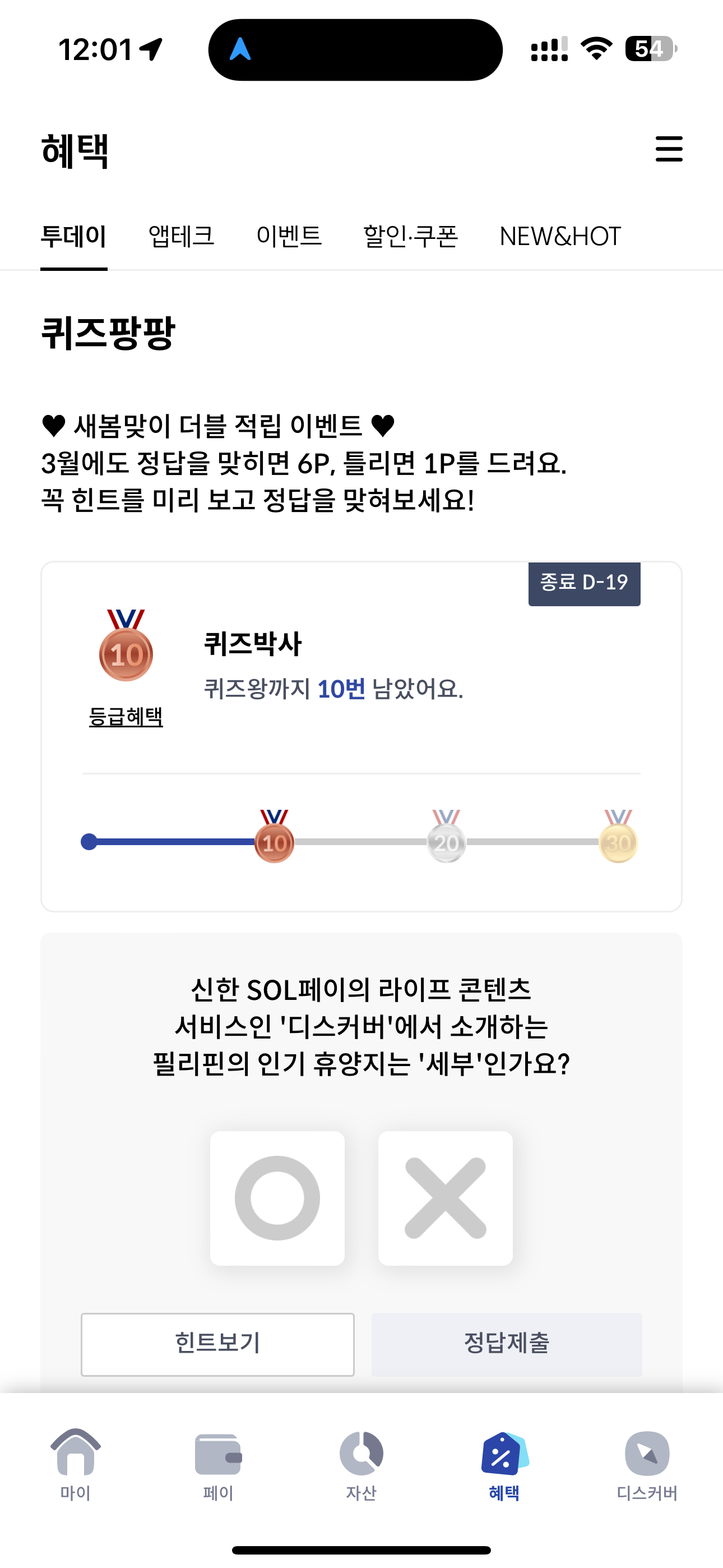 신한 SOL페이의 라이프 콘텐츠 서비스인 '디스커버'에서 소개하는 필리핀의 인기 휴양지는 '세부'인가요? O,X 퀴즈인데요. 신한 SOL페이 디스커버를 보면 요즘 뜨는 인기 휴양지를 볼 수 있습니다. 과거에 세부도 정말 많이 갔었죠. 요즘은 어떤 곳이 뜨고 있을까요?