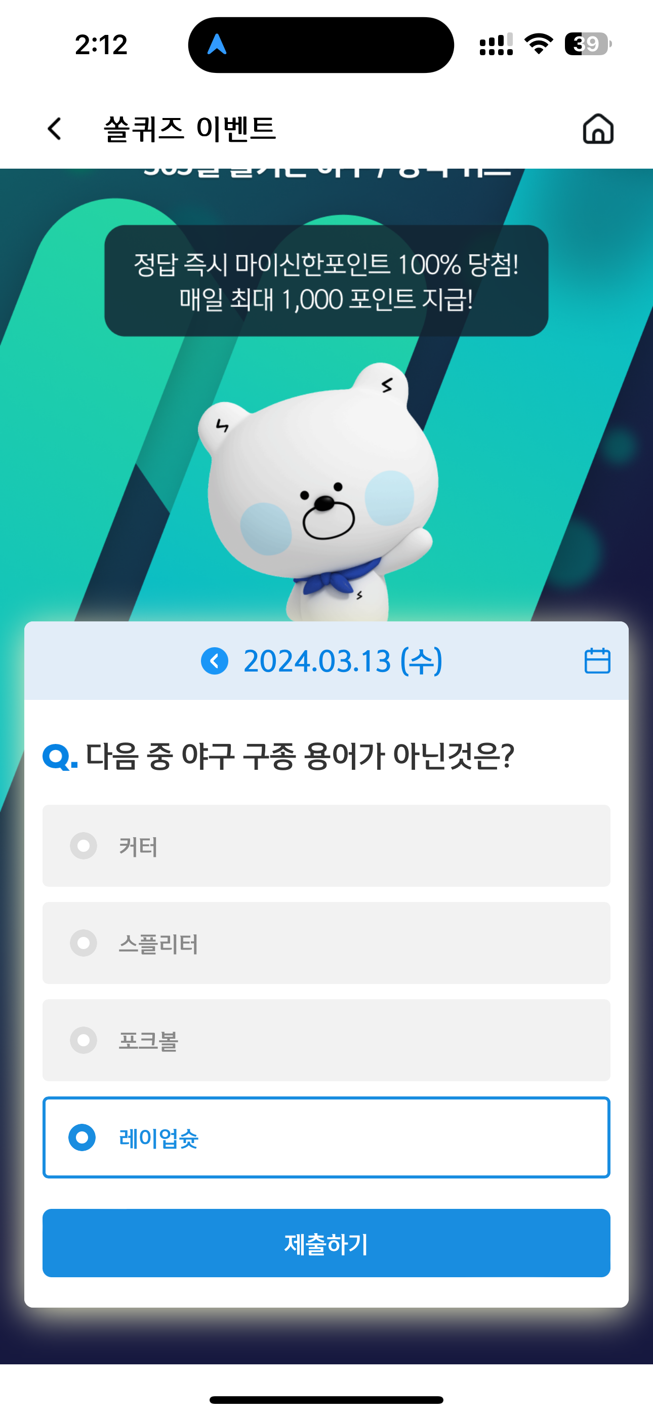 신한 슈퍼SOL 야구/상식 쏠퀴즈 3월 13일 문제입니다.