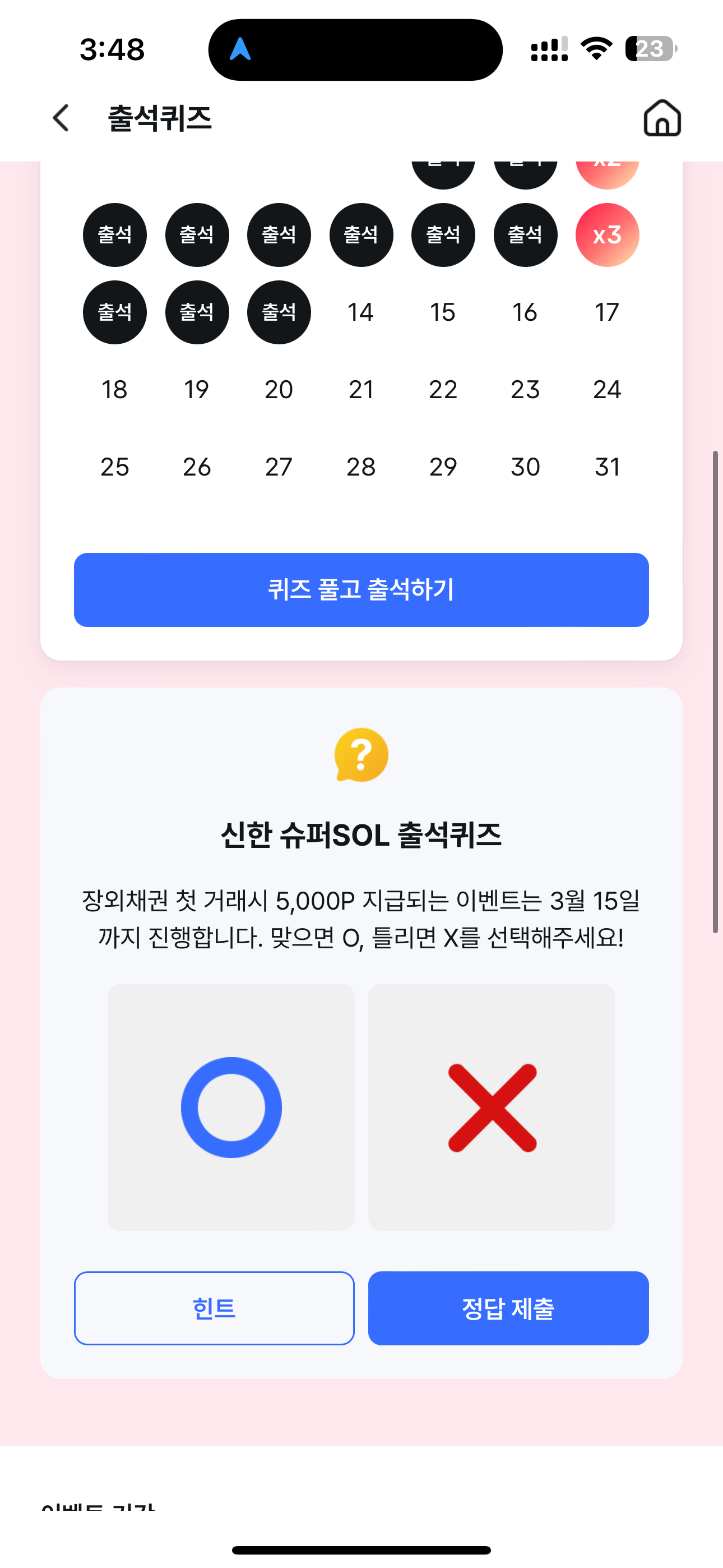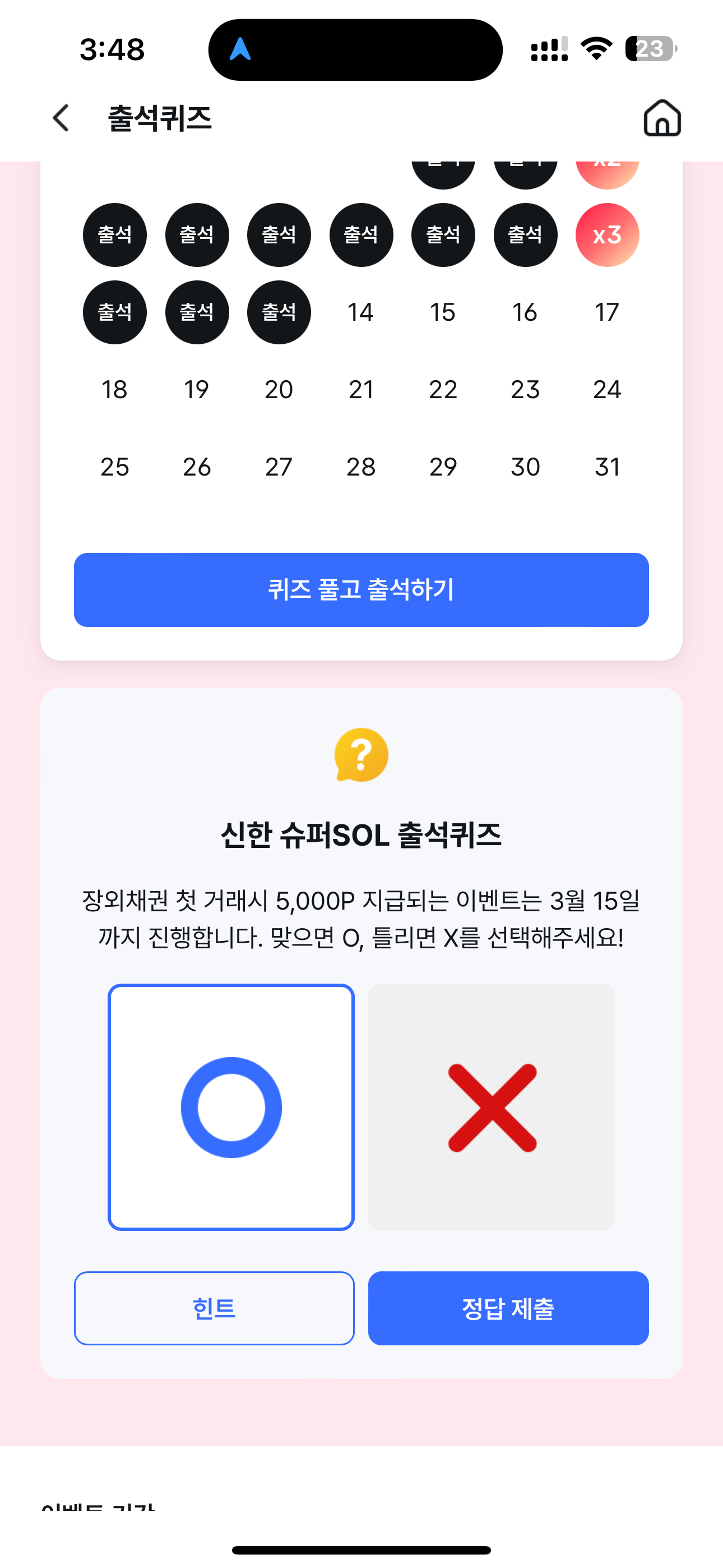 신한 슈퍼SOL 출석퀴즈 정답은 O 입니다
