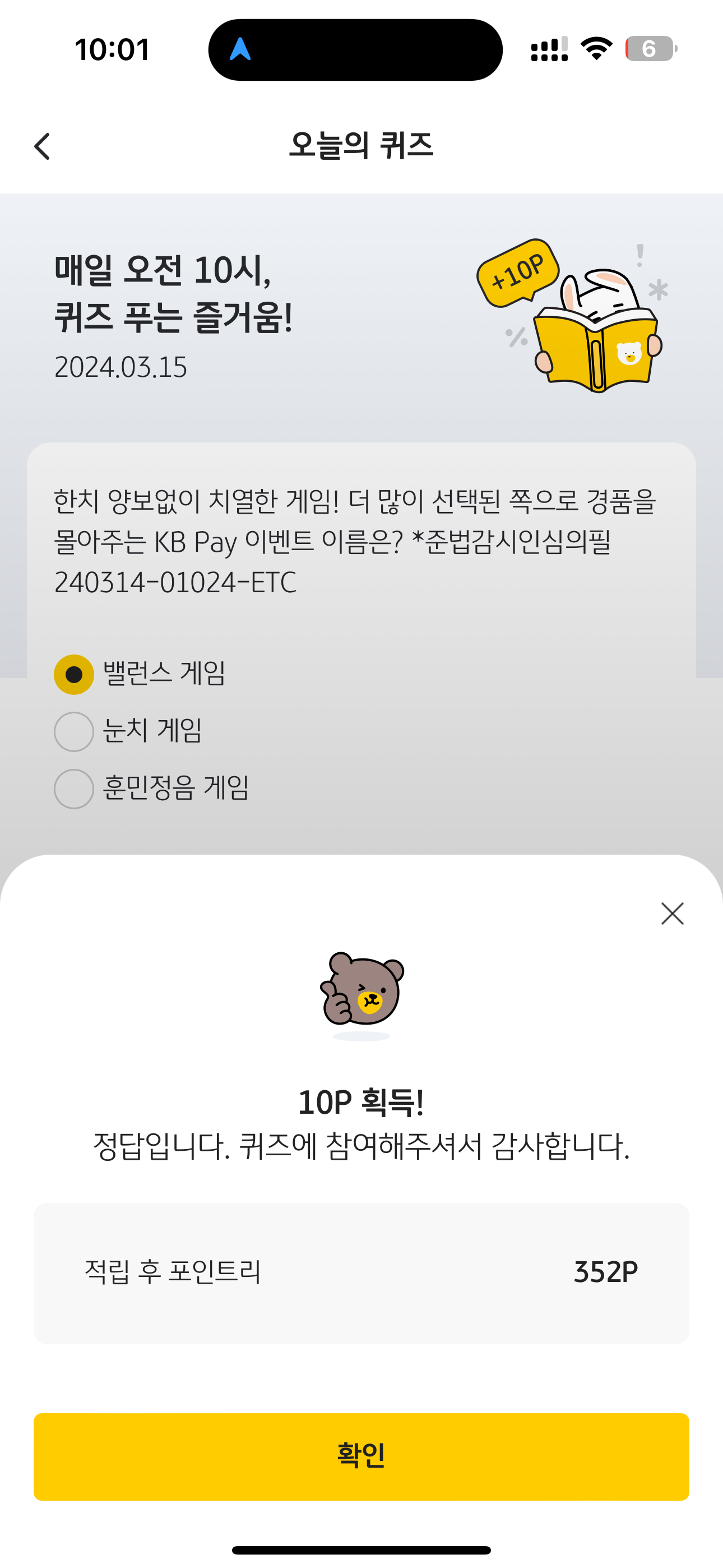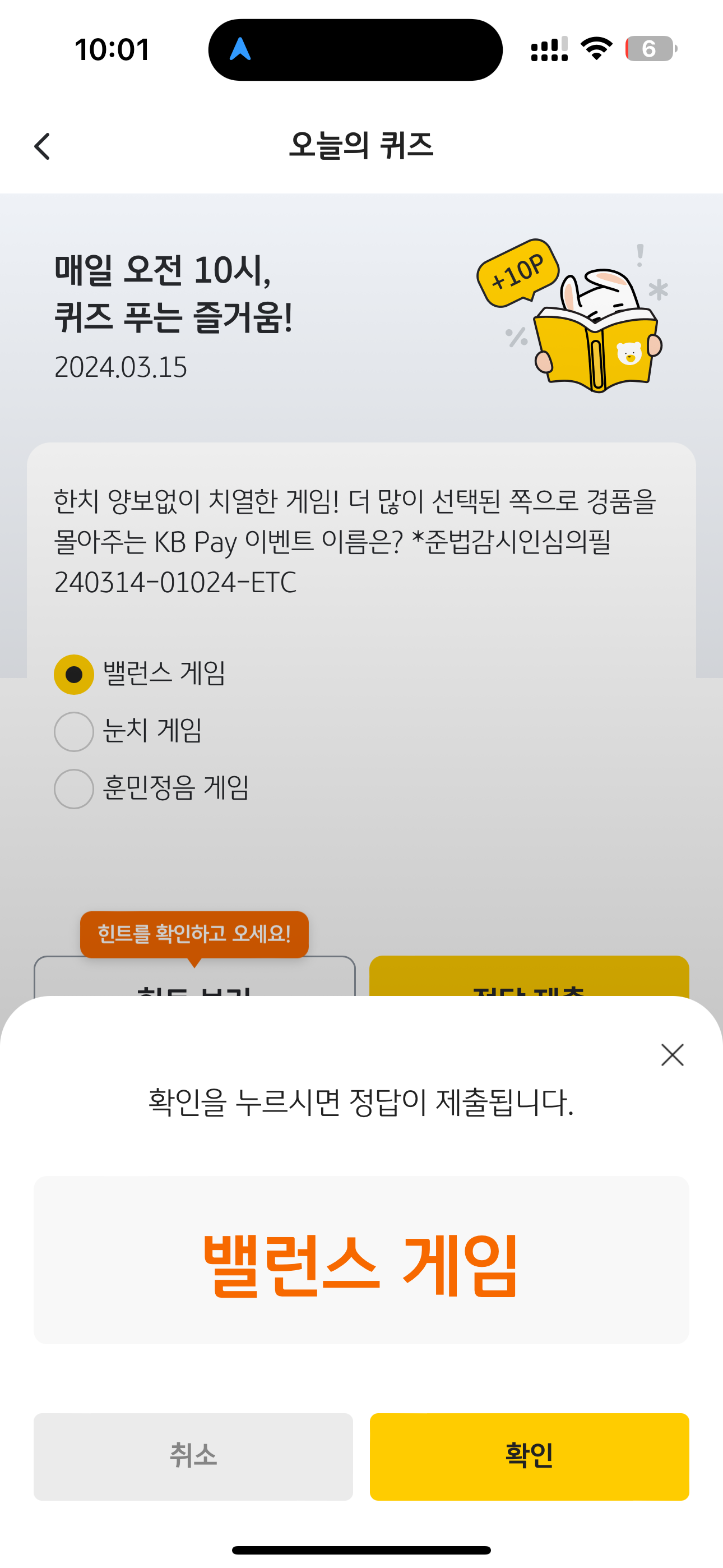 KB Pay 오늘의 퀴즈 정답은 밸런스 게임 입니다
