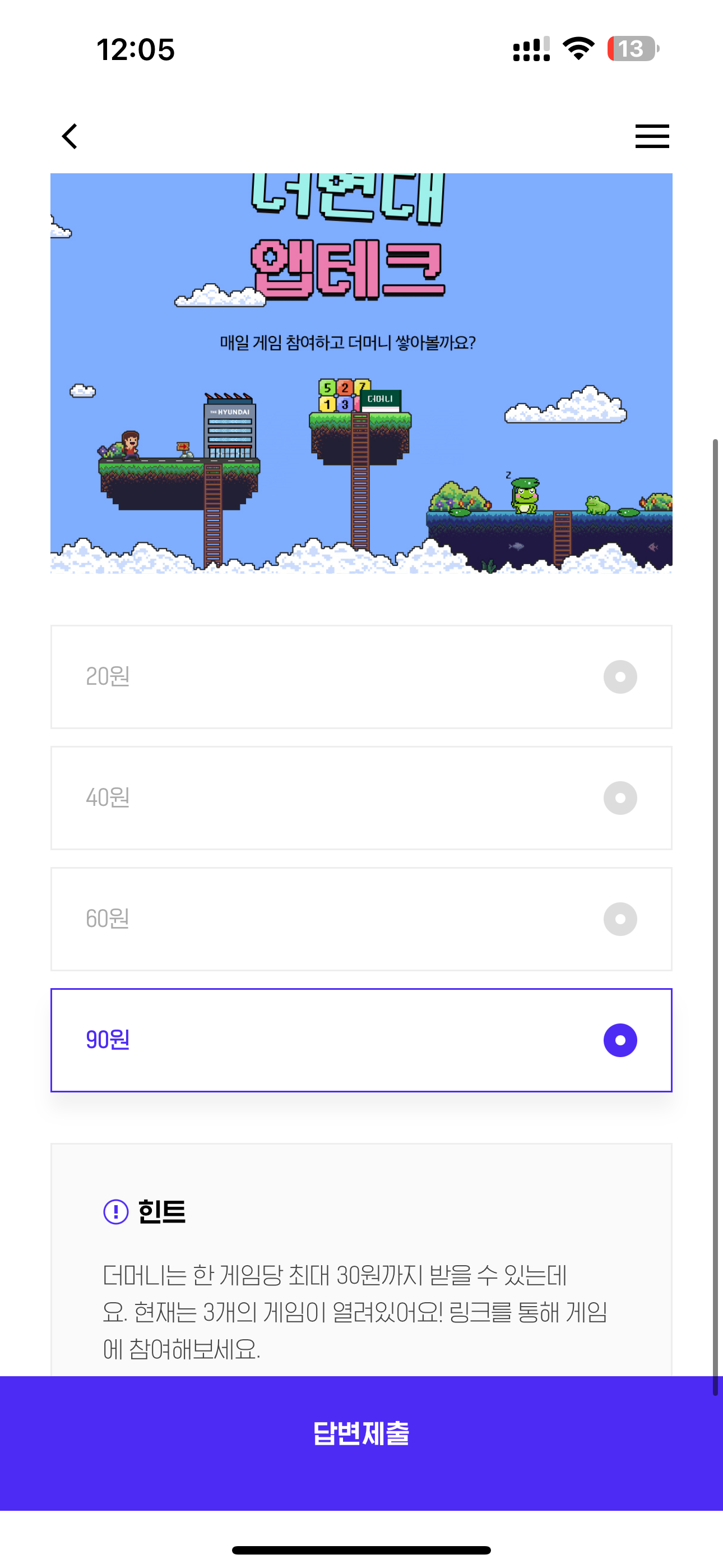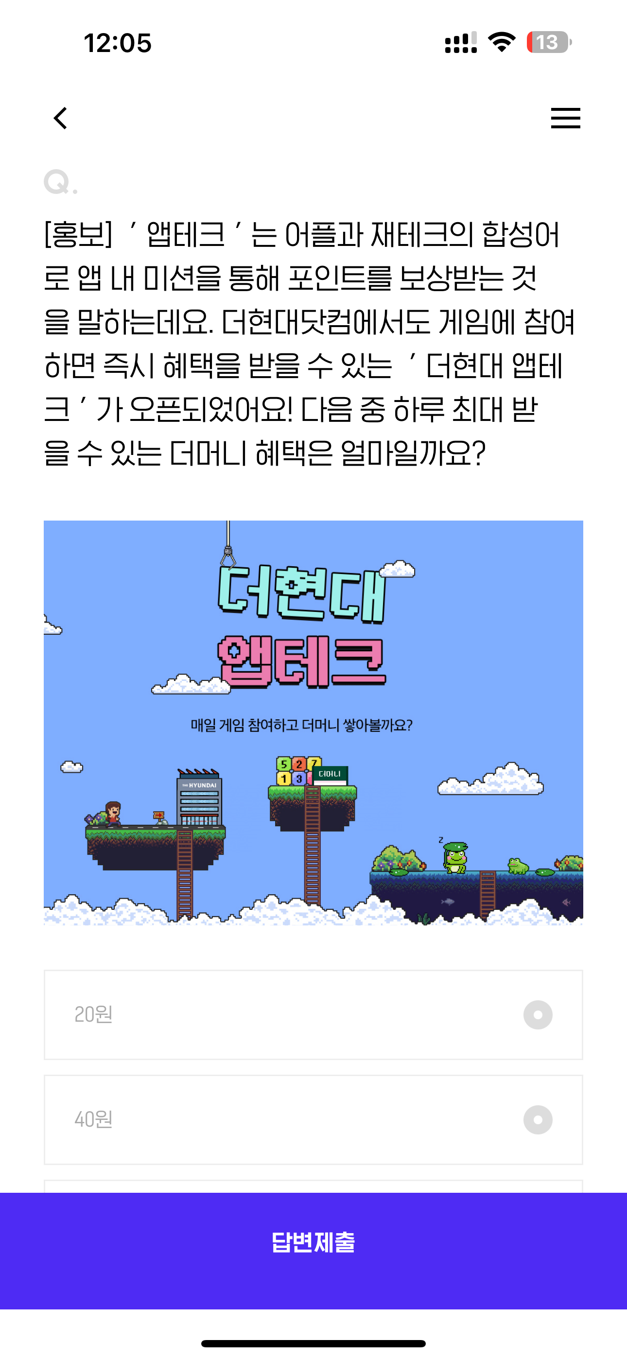 [홍보] ' 앱테크 ' 는 어플과 재테크의 합성어로 앱 내 미션을 통해 포인트를 보상받는 것을 말하는데요. 더현대닷컴에서도 게임에 참여하면 즉시 혜택을 받을 수 있는 ' 더현대 앱테크 ' 가 오픈되었어요! 다음 중 하루 최대 받을 수 있는 더머니 혜택은 얼마일까요? 보기는 1. 20월 2. 40원 3. 60원 4. 90원 입니다