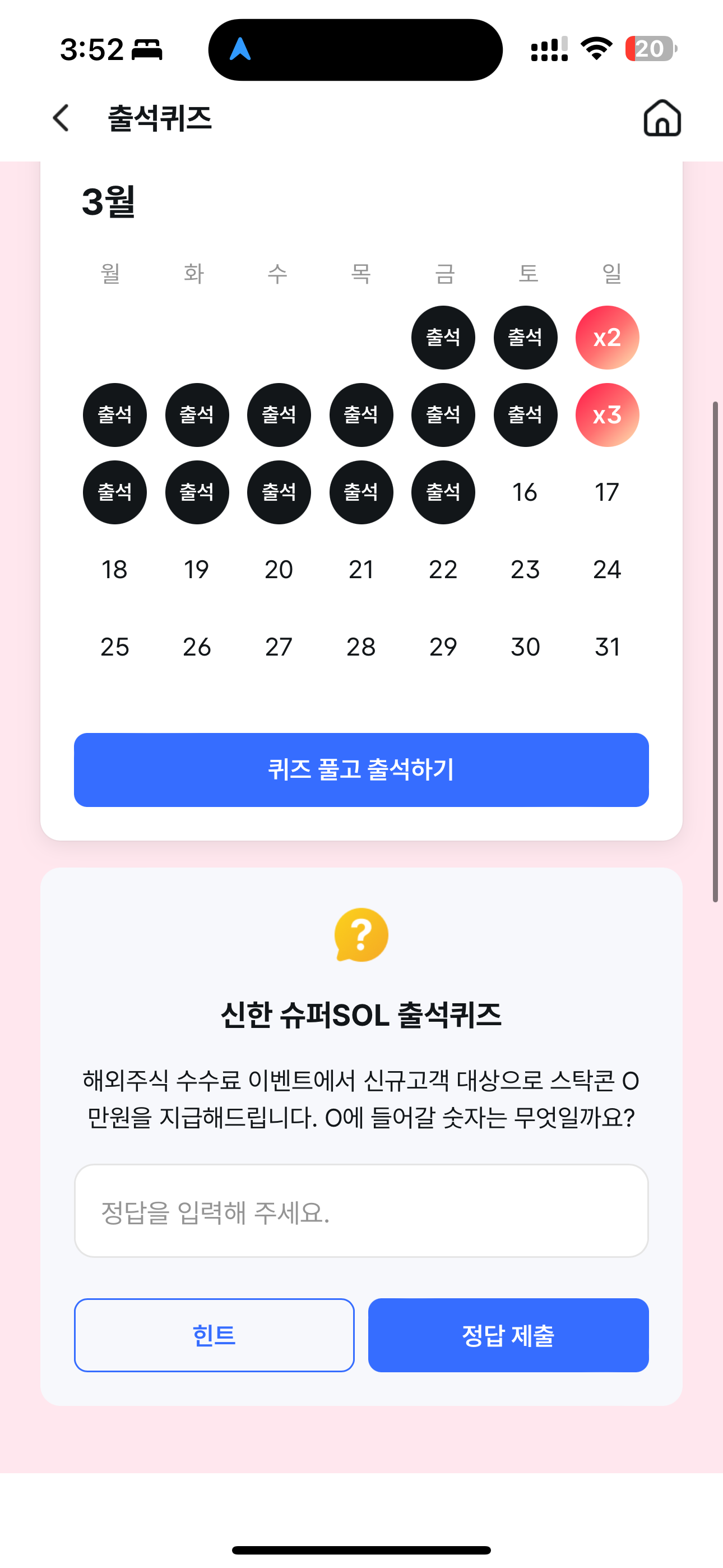 신한 슈퍼SOL 출석퀴즈 정답은 2입니다