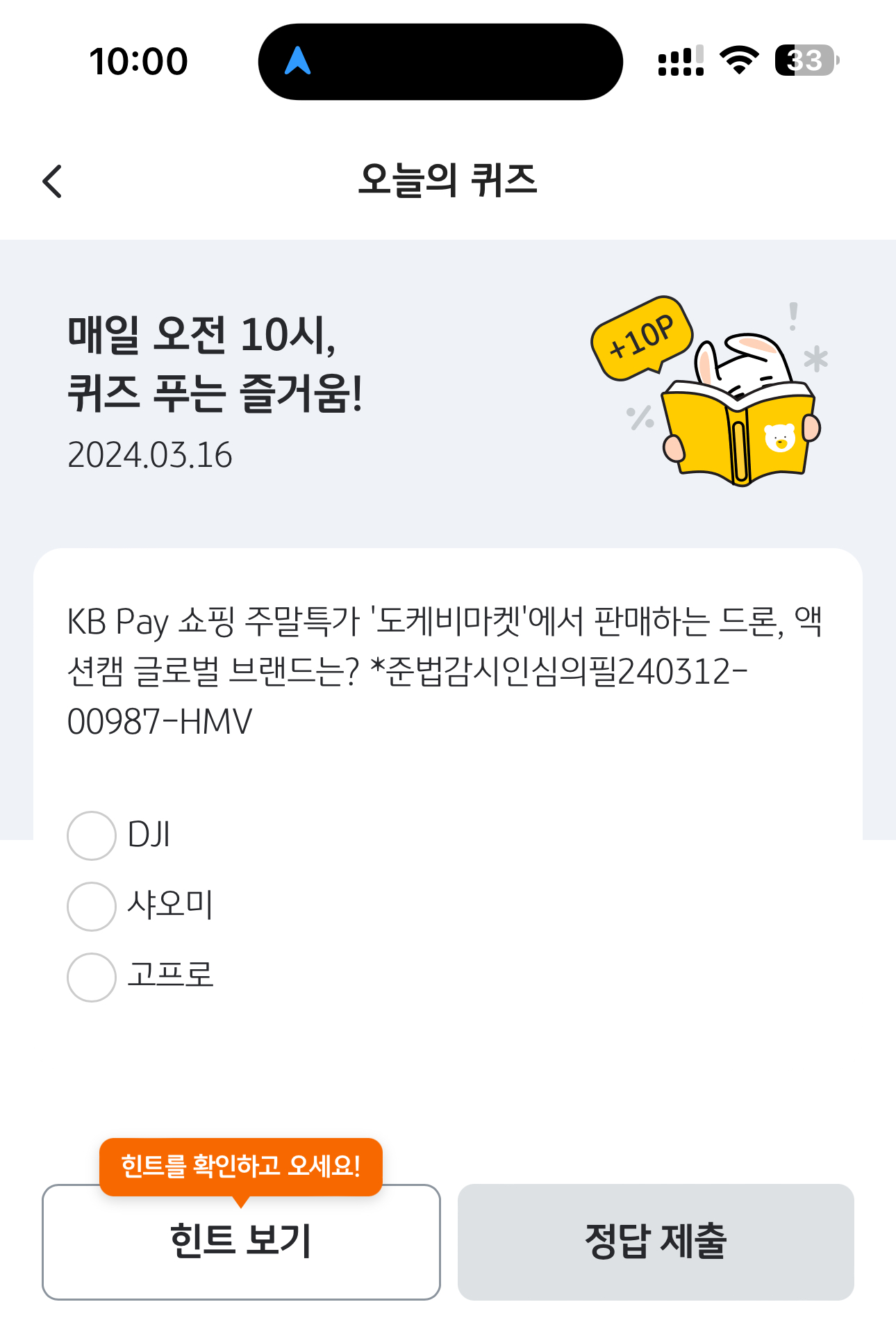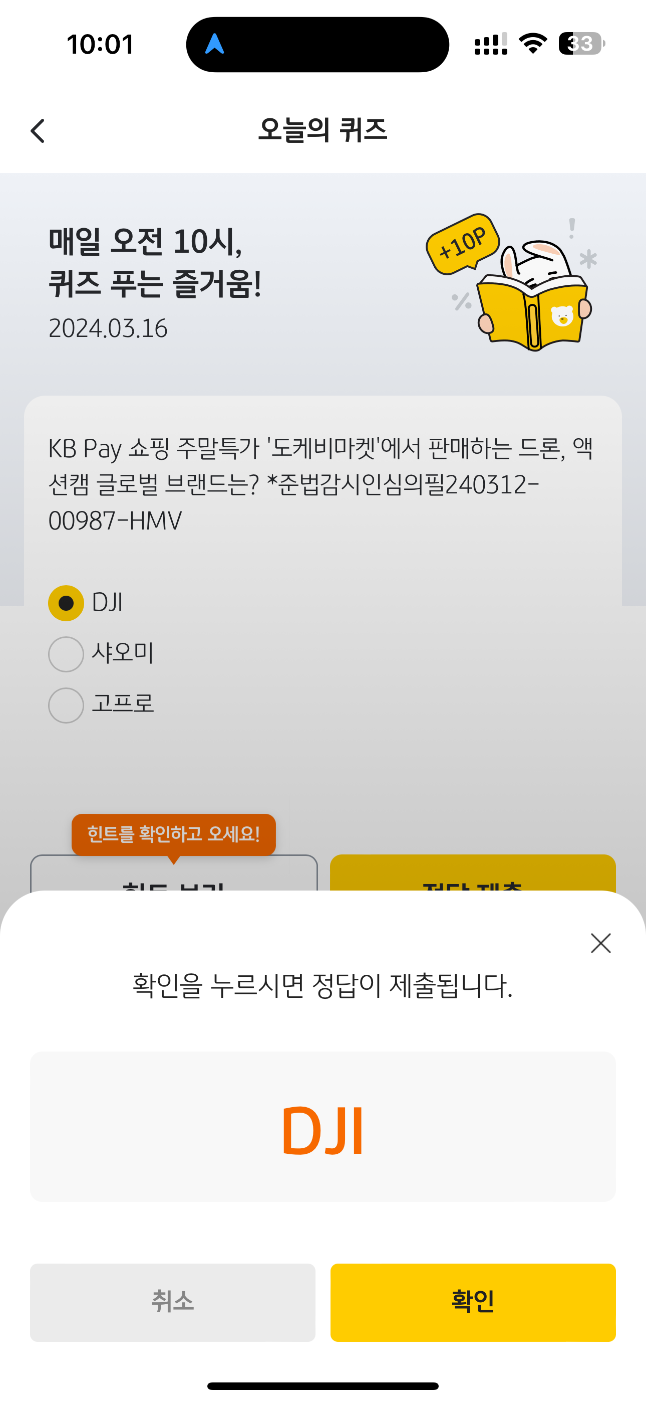 KB Pay 오늘의 퀴즈 정답은 DJI 입니다