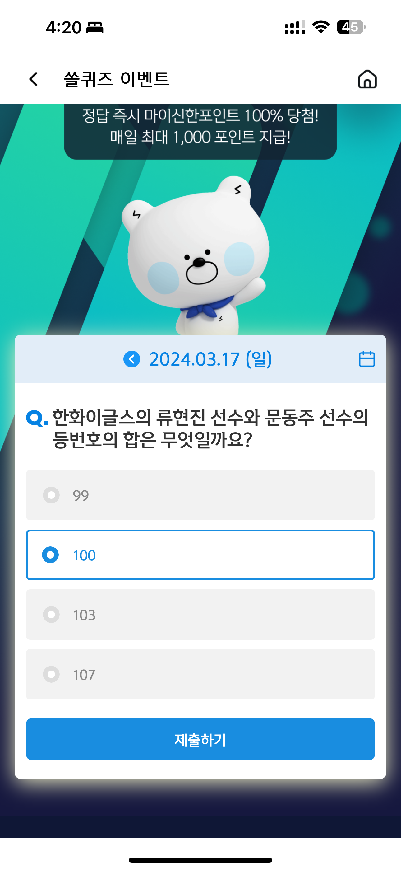 신한 슈퍼SOL 야구/상식 쏠퀴즈 정답은 100 입니다