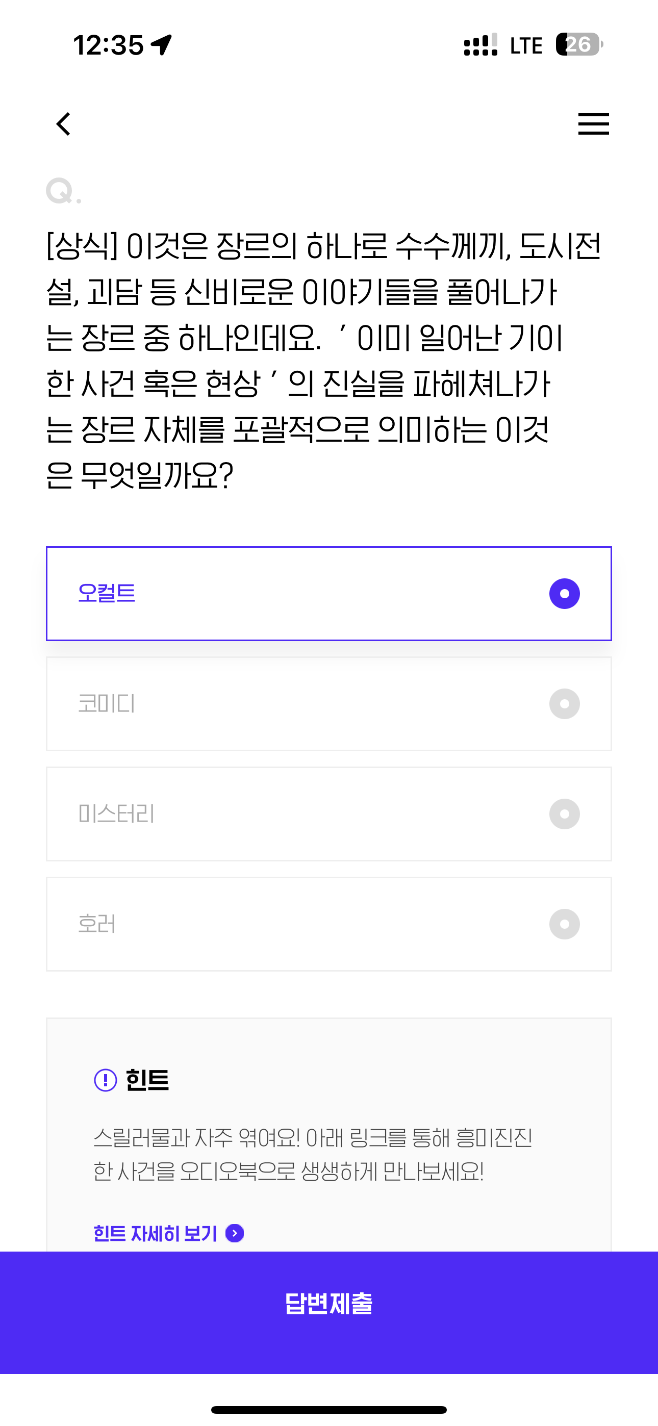 [상식] 이것은 장르의 하나로 수수께끼, 도시전설, 괴담 등 신비로운 이야기들을 풀어나가는 장르 중 하나인데요. ' 이미 일어난 기이한 사건 혹은 현상 ' 의 진실을 파헤쳐나가는 장르 자체를 포괄적으로 의미하는 이것은 무엇일까요? 보기는 1. 오컬트 2. 코미디 3. 미스터리 4. 호러 입니다.