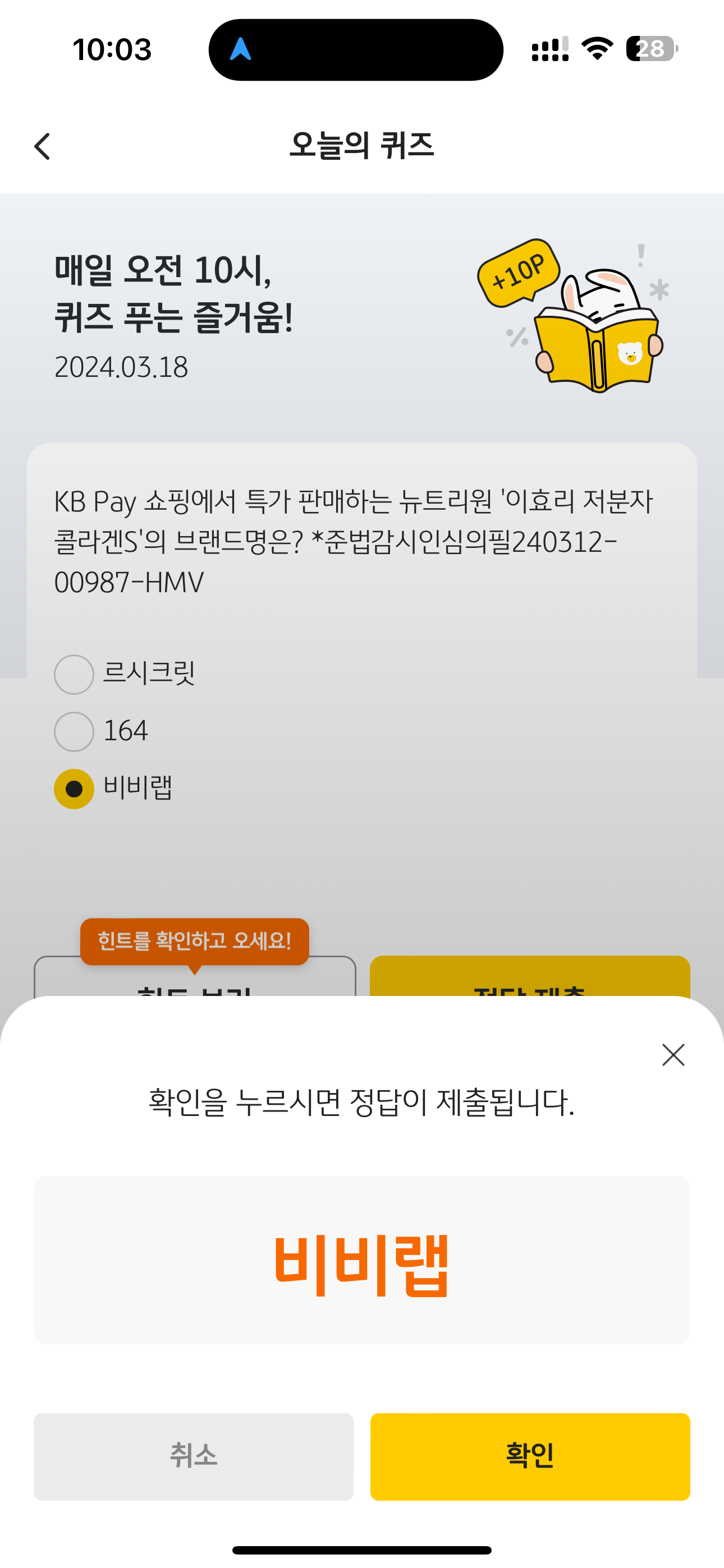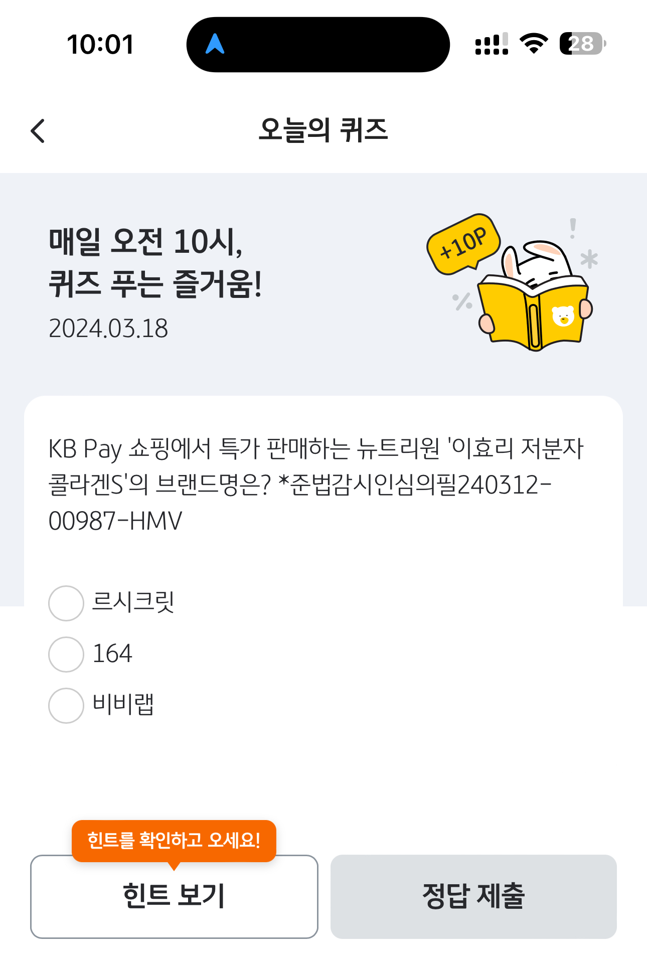 KB Pay 오늘의 퀴즈 3월 18일 정답(KB Pay 쇼핑에서 특가 판매하는 뉴트리원 '이효리 저분자 콜라겐S'의 브랜드명은?)