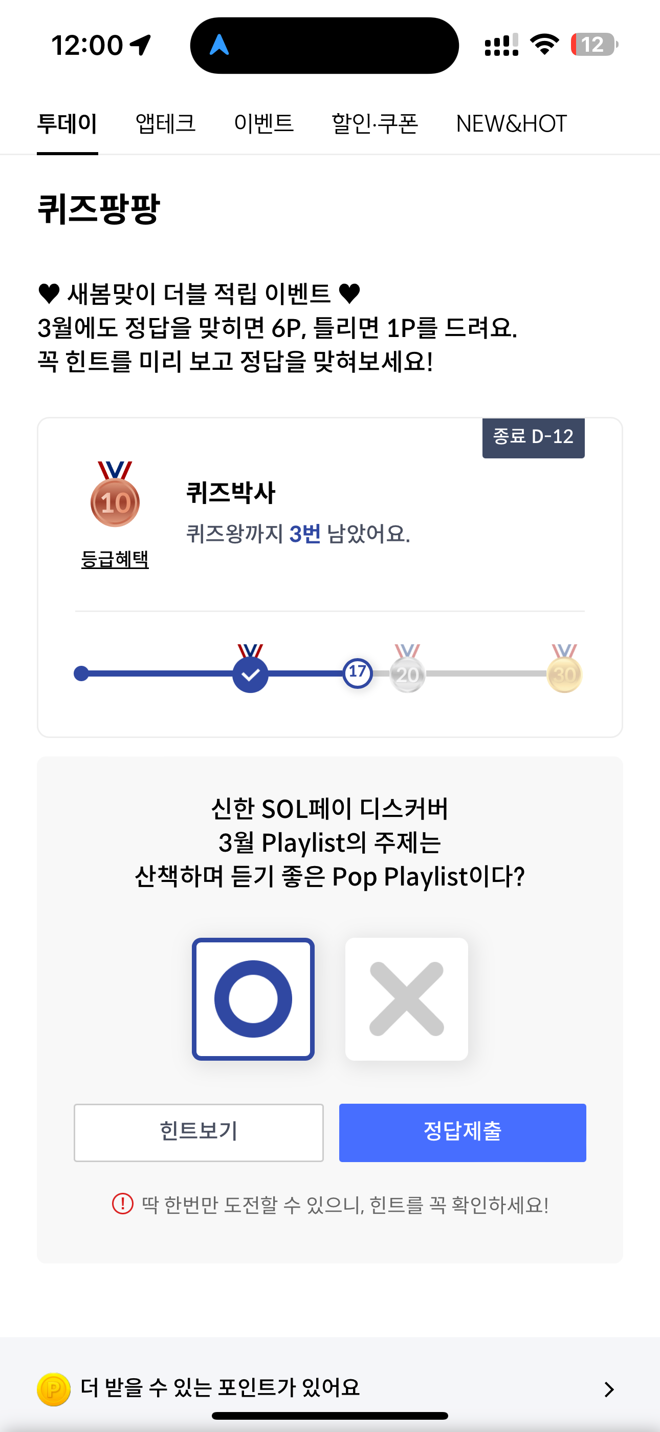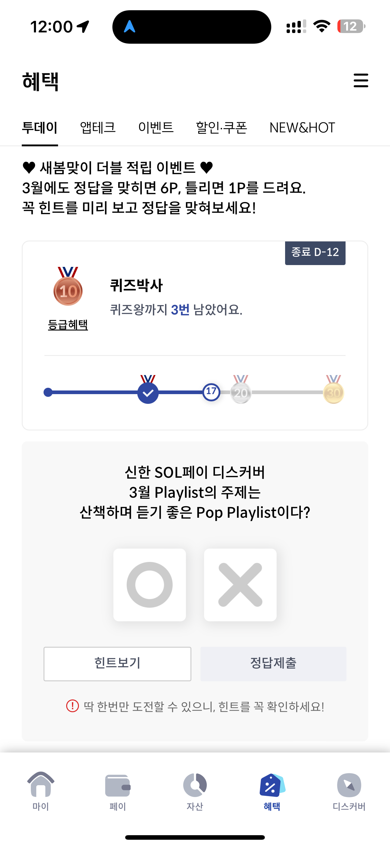 신한 SOL페이 디스커버 3월 Playlist의 주제는 산책하며 듣기 좋은 Pop Playlist이다? O,X 퀴즈인데요. 신한 SOL페이는 매달 다양한 플레이리스트를 선보이고 있습니다. 다양한 음악을 큐레이션으로 들을 수 있는데요. 매달 다양한 컨셉의 플레이리스트를 만날 수 있으니 확인해 보세요