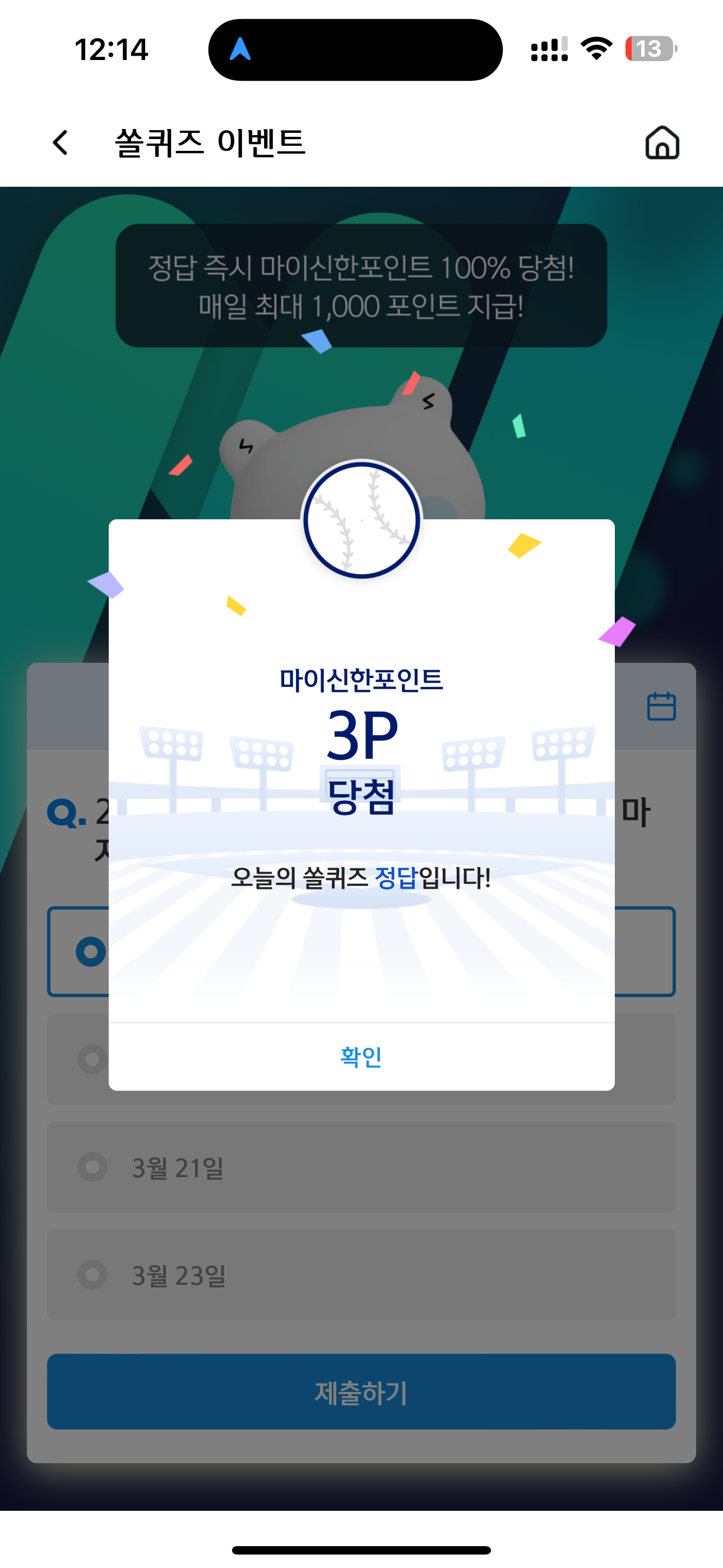 신한 슈퍼SOL 야구/상식 쏠퀴즈 정답은 3월 19일 입니다