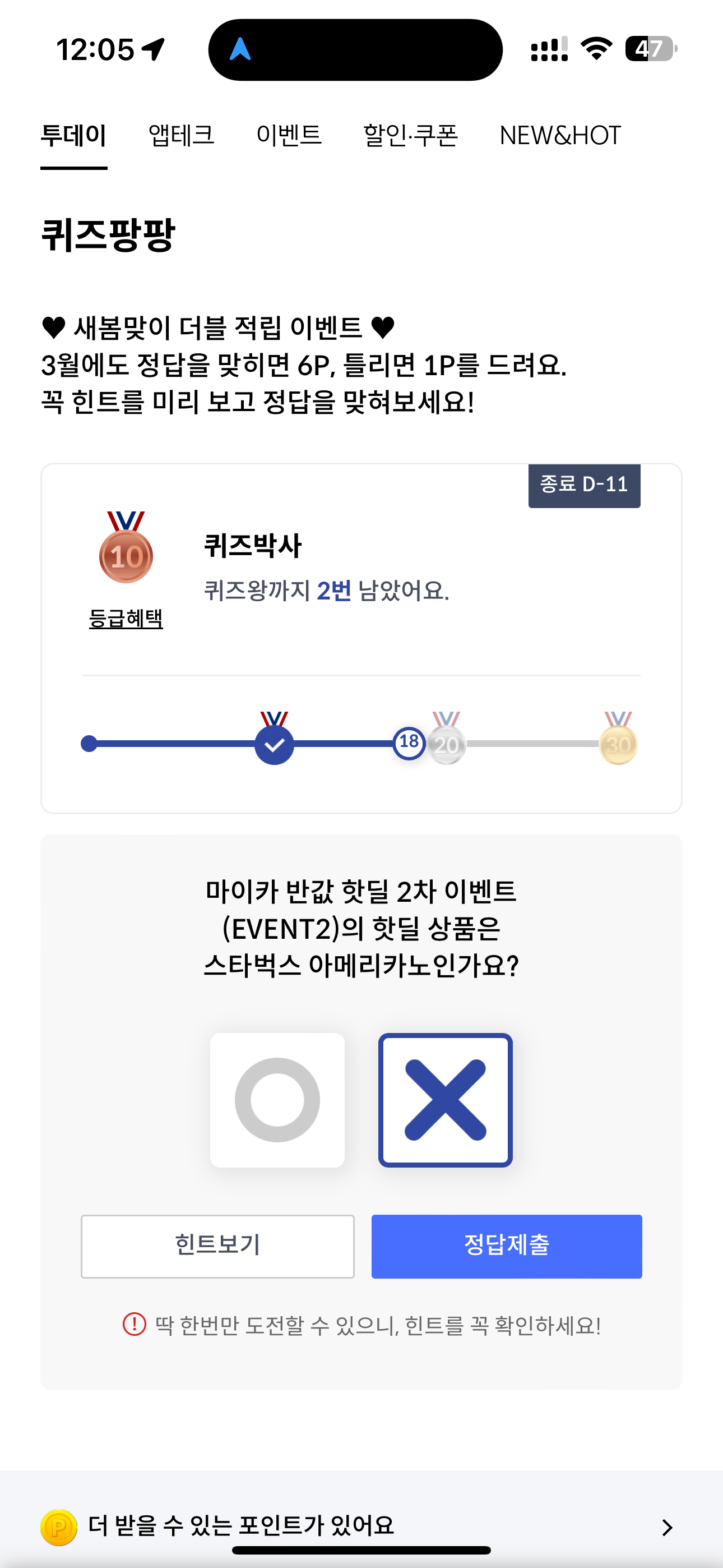 신한카드 퀴즈팡팡 3월 20일 정답(마이카 반값 핫딜 2차 이벤트(EVENT2)의 핫딜 상품은 스타벅스 아메리카노인가요?)
