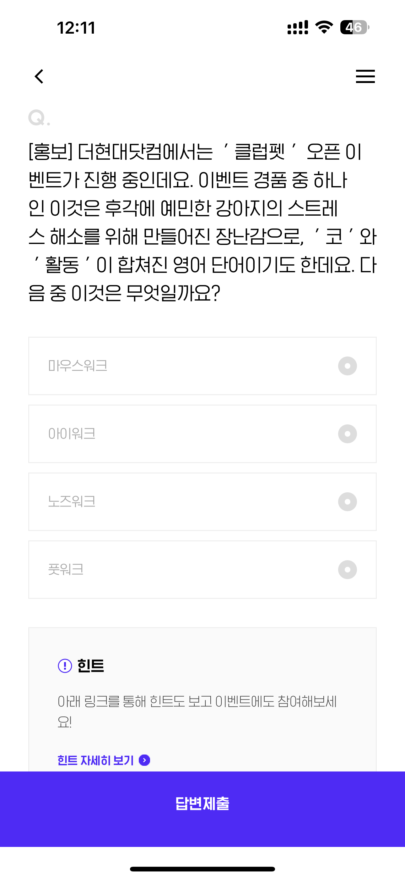 [홍보] 더현대닷컴에서는 ' 클럽펫 ' 오픈 이벤트가 진행 중인데요. 이벤트 경품 중 하나인 이것은 후각에 예민한 강아지의 스트레스 해소를 위해 만들어진 장난감으로, ' 코 ' 와 ' 활동 ' 이 합쳐진 영어 단어이기도 한데요. 다음 중 이것은 무엇일까요? 보기는 1. 마우스워크 2. 아이워크 3. 노즈워크 4. 풋워크 입니다.