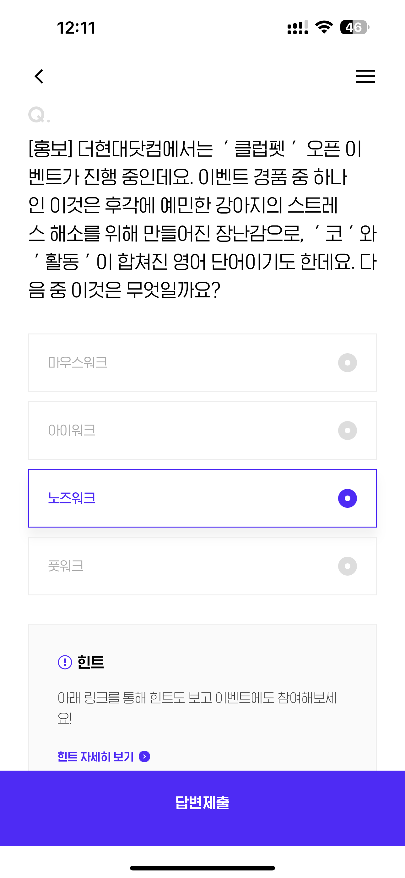 [홍보] 더현대닷컴에서는 ' 클럽펫 ' 오픈 이벤트가 진행 중인데요. 이벤트 경품 중 하나인 이것은 후각에 예민한 강아지의 스트레스 해소를 위해 만들어진 장난감으로, ' 코 ' 와 ' 활동 ' 이 합쳐진 영어 단어이기도 한데요. 다음 중 이것은 무엇일까요? 보기는 1. 마우스워크 2. 아이워크 3. 노즈워크 4. 풋워크 입니다.
