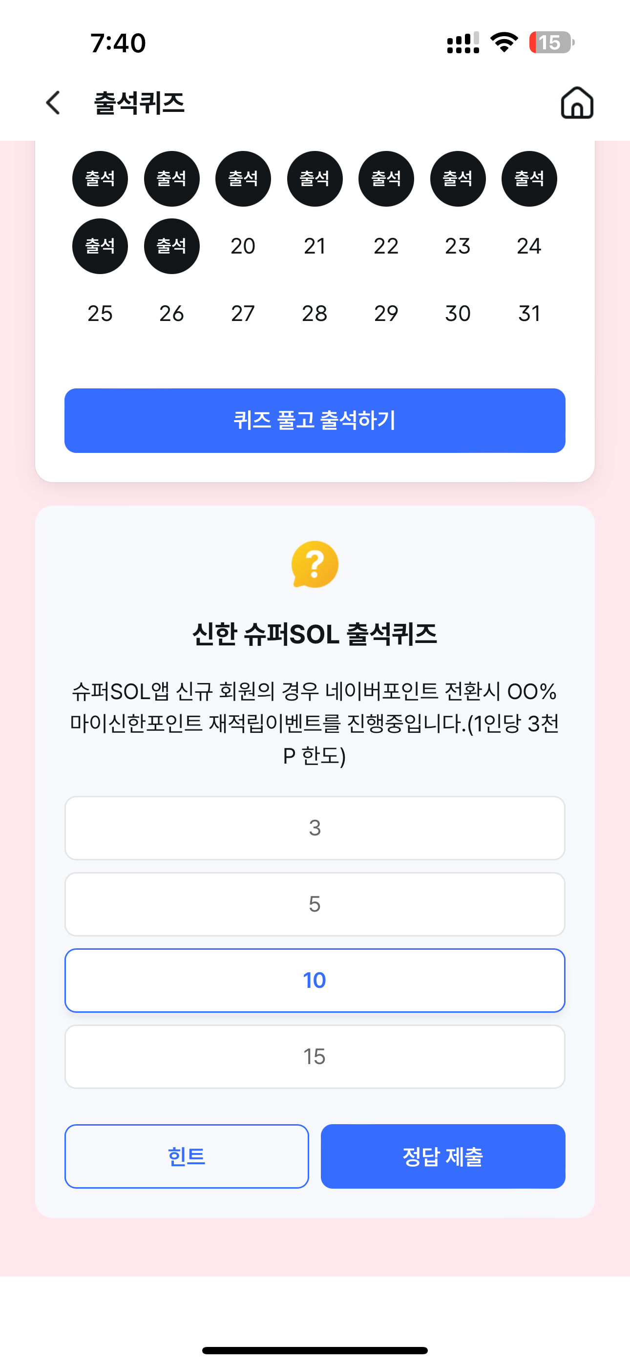 신한 슈퍼SOL 출석퀴즈 정답은 10 입니다