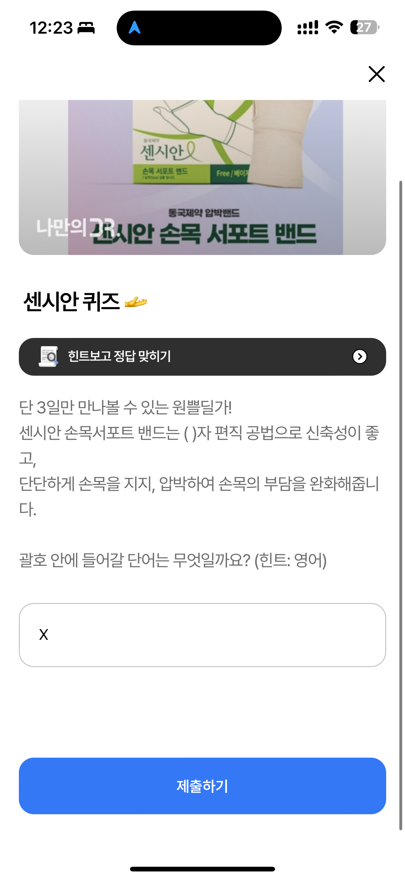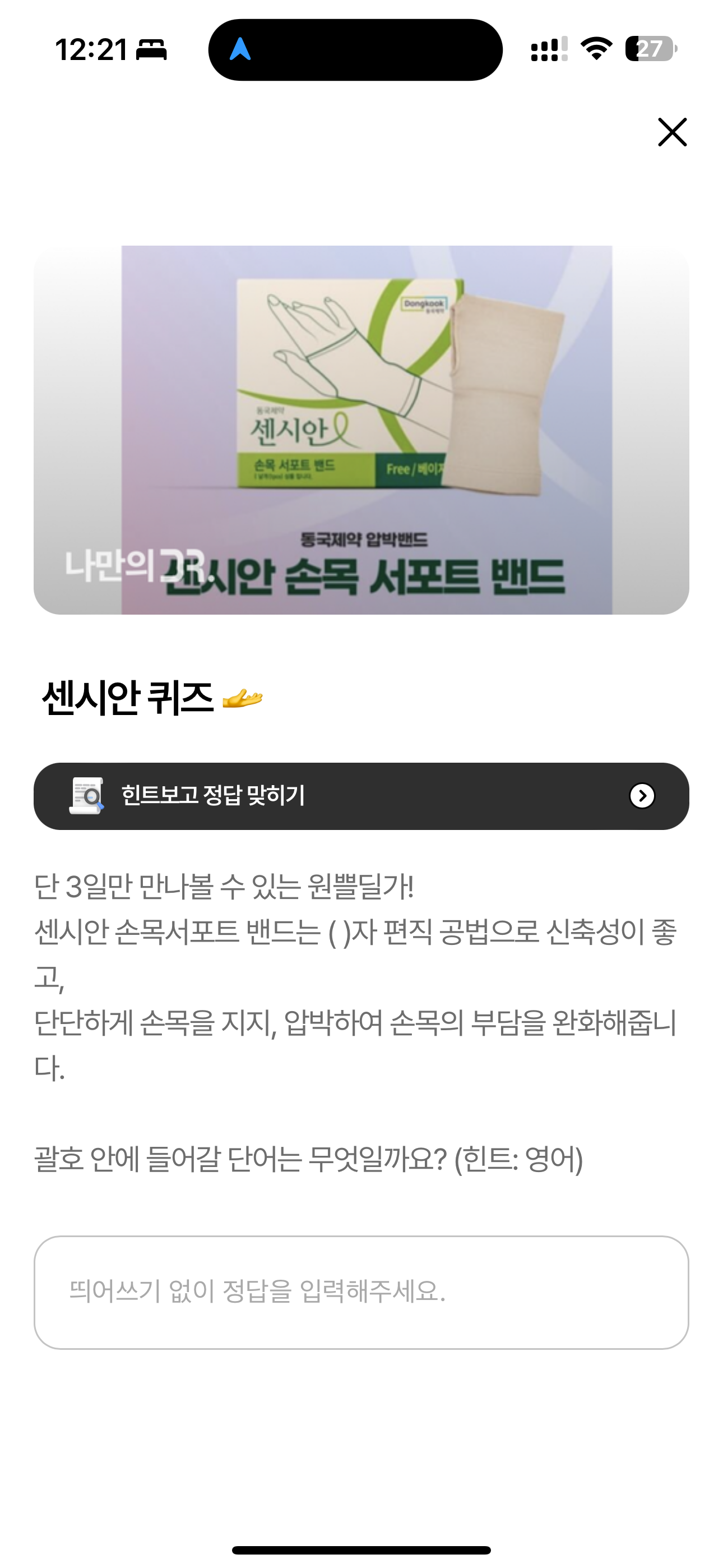 단 3일만 만나볼 수 있는 원쁠딜가! 센시안 손목서포트 밴드는 ( )자 편직 공법으로 신축성이 좋고, 단단하게 손목을 지지, 압박하여 손목의 부담을 완화해줍니다. 괄호 안에 들어갈 단어는 무엇일까요? (힌트: 영어)