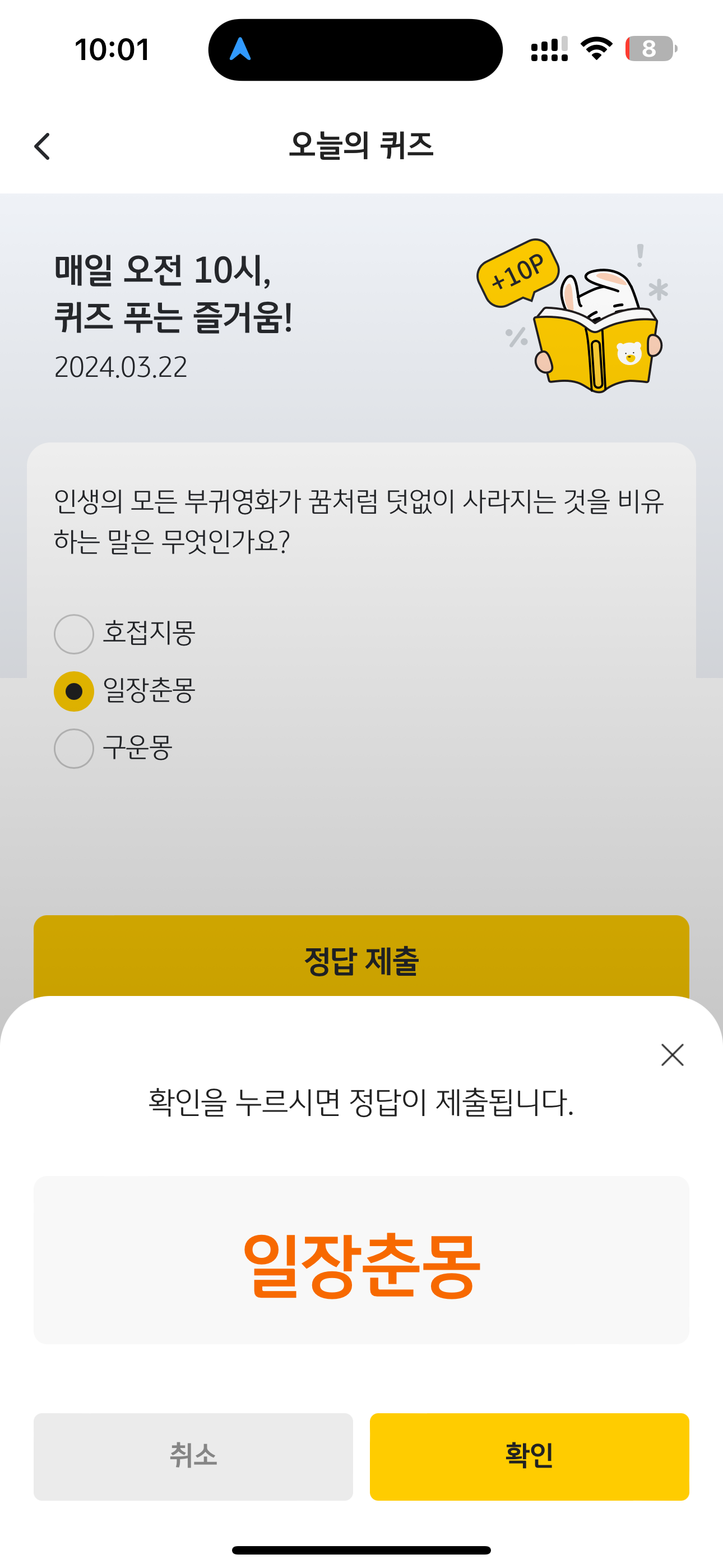 KB Pay 오늘의 퀴즈 정답은 일장춘몽 입니다