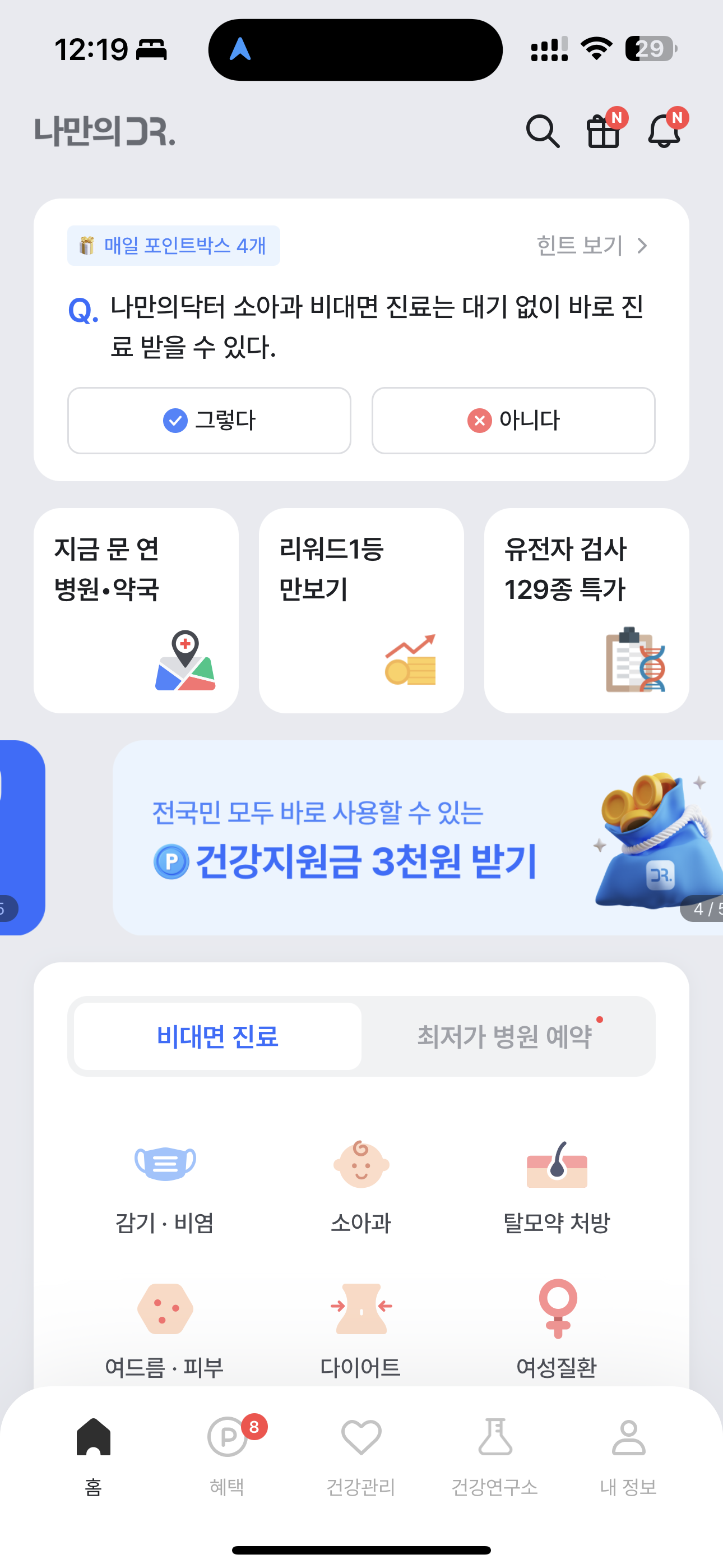 나만의닥터 소아과 비대면 진료는 대기 없이 바로 진료 받을 수 있다. 그렇다. 아니다 선택하시면 되는데요. 비대면 진료는 전화/화상으로 하는 진료입니다. 소아과의 경우 오픈런 한다는 이야기가 많죠. 집에서 전화/화상으로 할 수 있어 이런걸 겪지 않아도 됩니다. 그리고 어린이 약국에서 약 조제를 받을 수 있습니다.