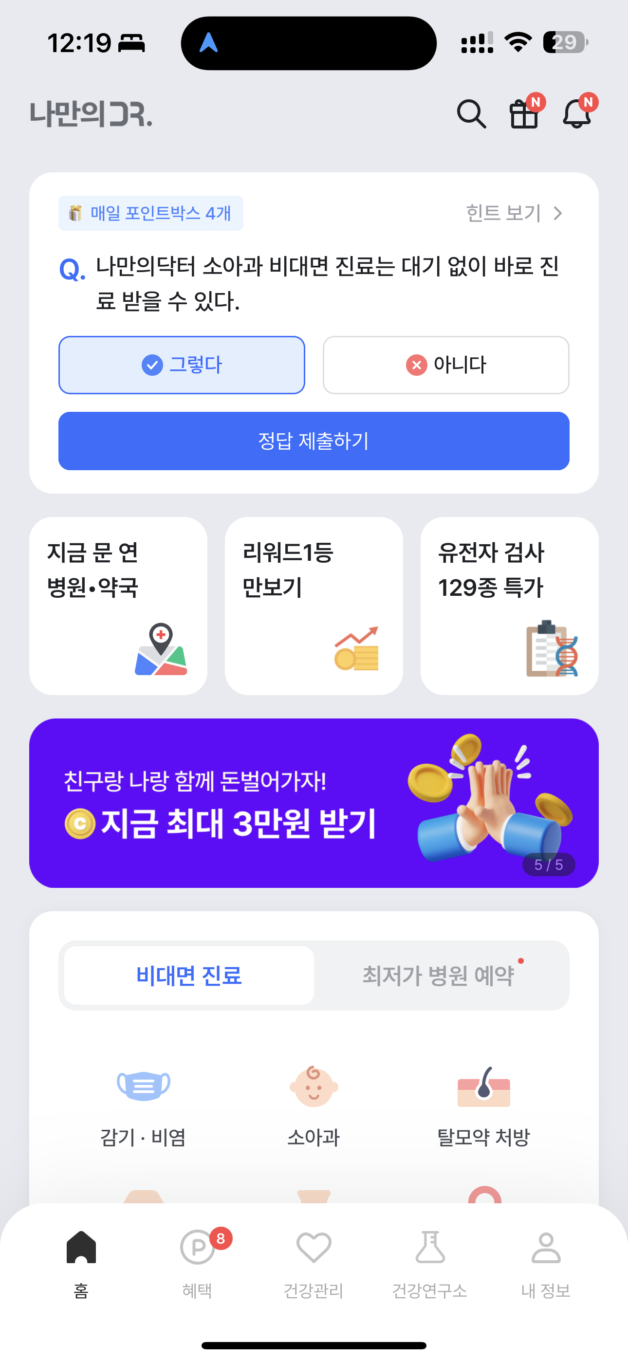 나만의닥터 퀴즈 3월 23일 정답(나만의닥터 소아과 비대면 진료는 대기 없이 바로 진료 받을 수 있다)