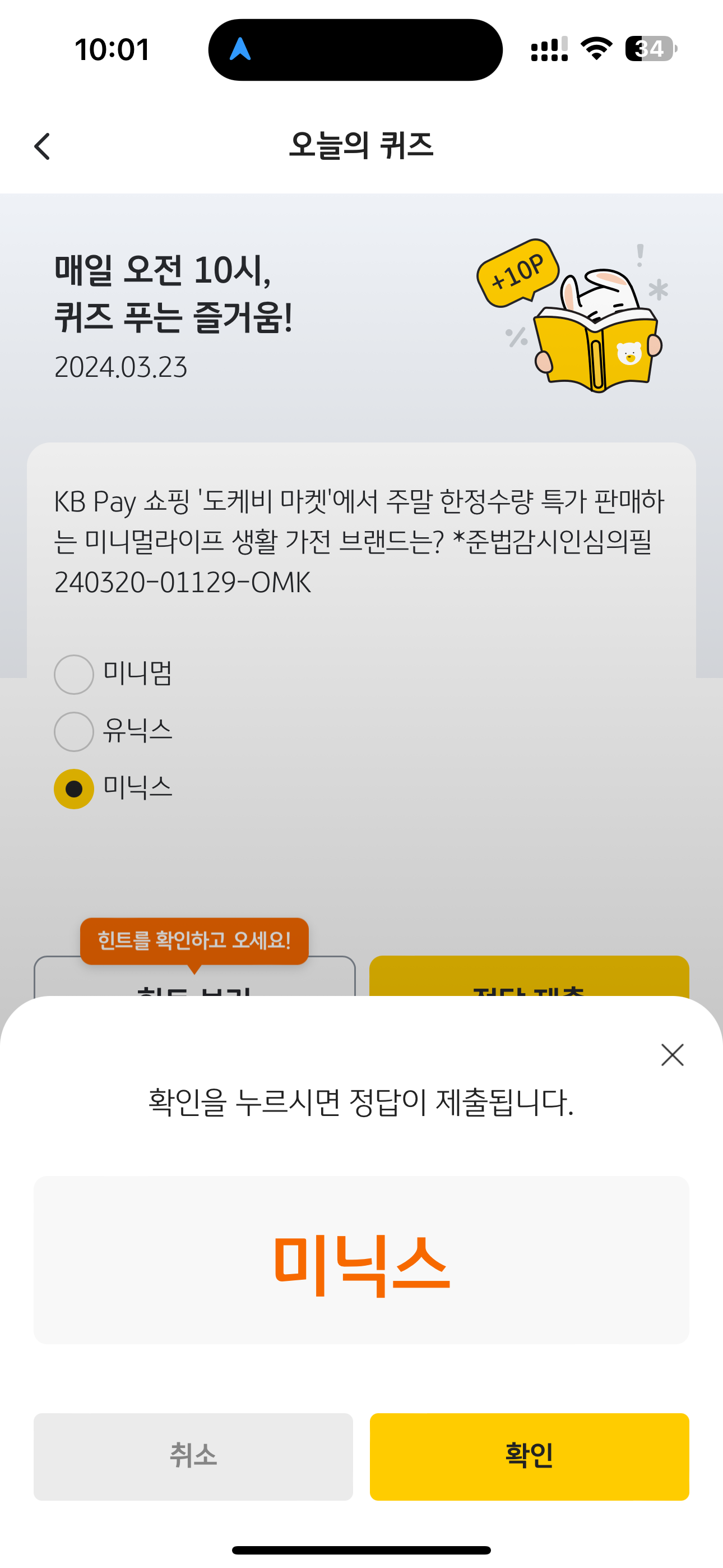 KB Pay 오늘의 퀴즈 정답은 미닉스 입니다