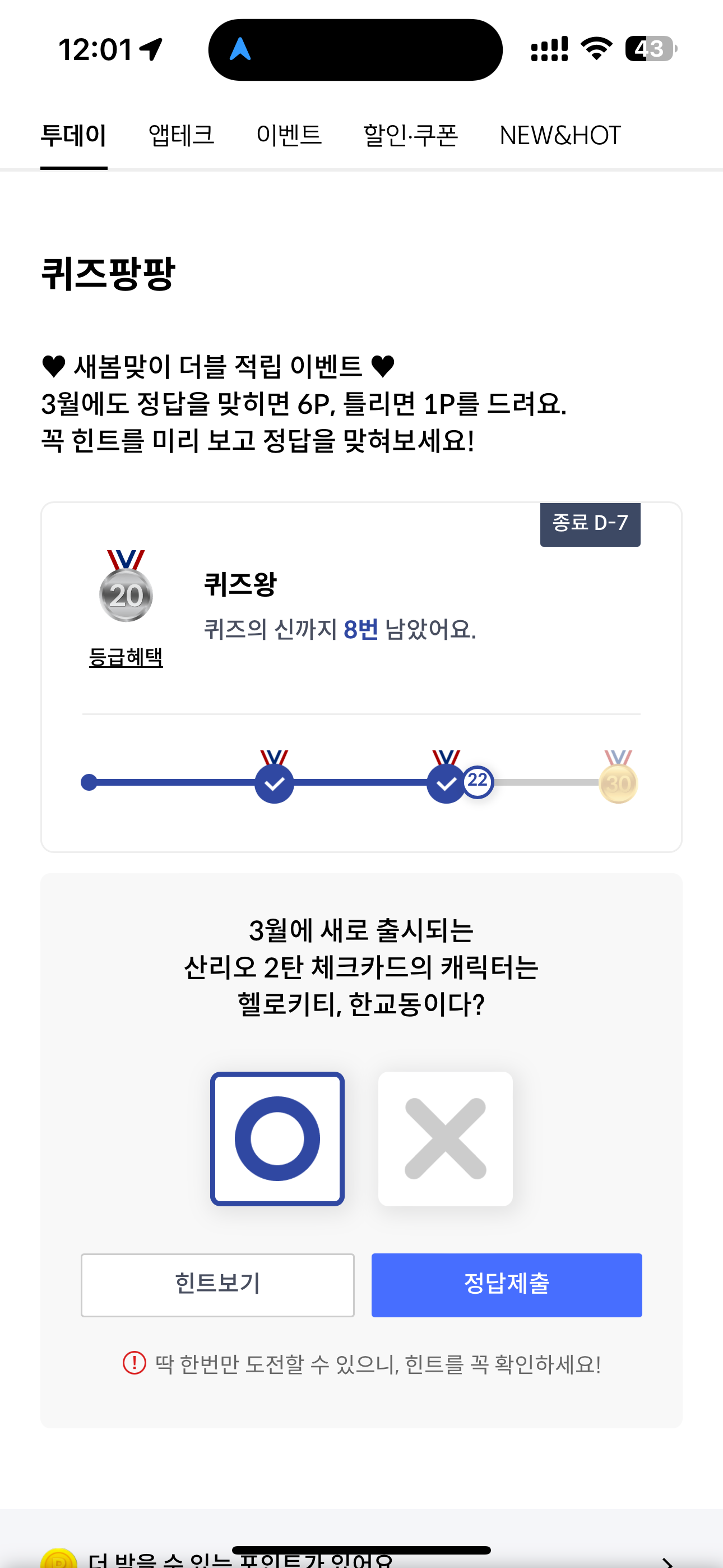 신한카드 퀴즈팡팡 정답은 O 입니다