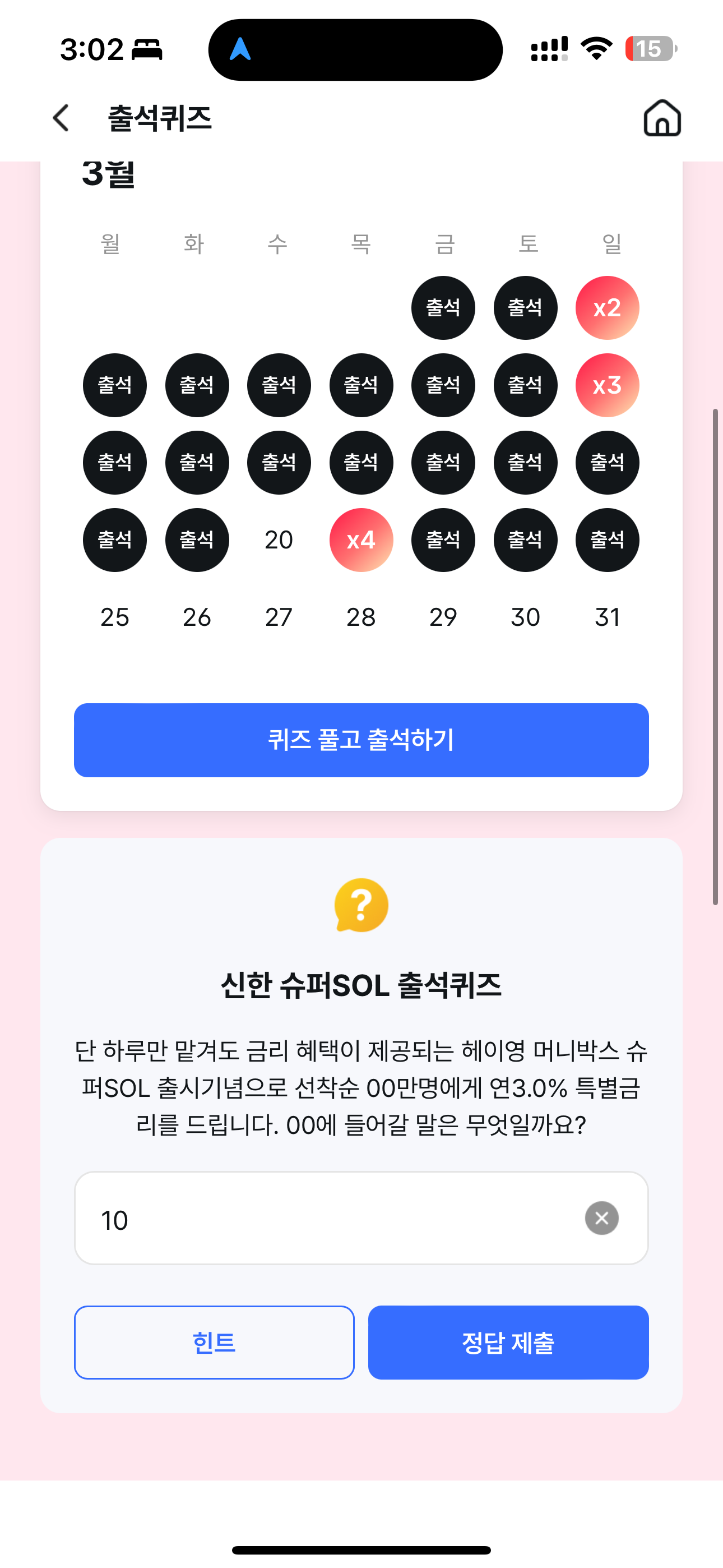 신한 슈퍼SOL 출석퀴즈 정답은 10 입니다
