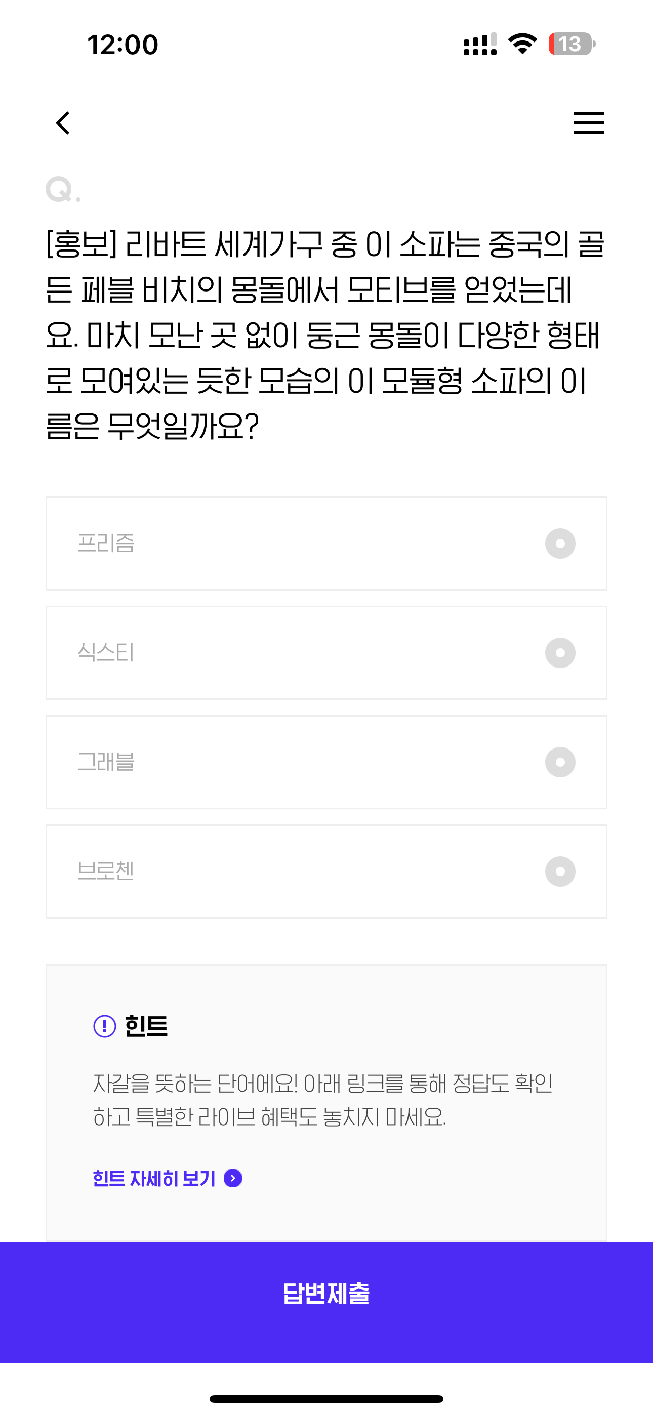 [홍보] 리바트 세계가구 중 이 소파는 중국의 골든 페블 비치의 몽돌에서 모티브를 얻었는데요. 마치 모난 곳 없이 둥근 몽돌이 다양한 형태로 모여있는 듯한 모습의 이 모듈형 소파의 이름은 무엇일까요? 보기는 1. 프리즘 2. 식스티 3. 그래블 4. 브로첸 입니다.