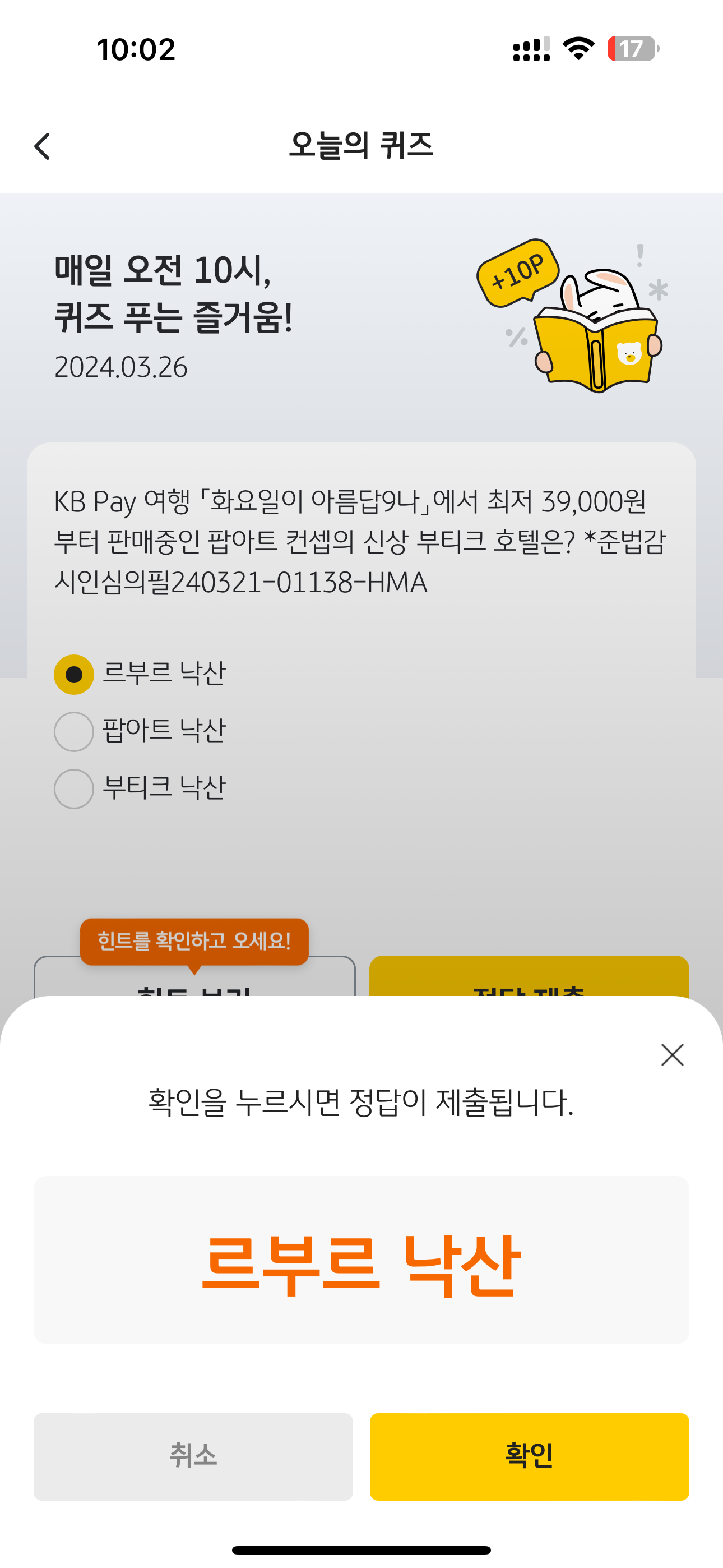 KB Pay 오늘의 퀴즈 정답은 르부르 낙산 입니다