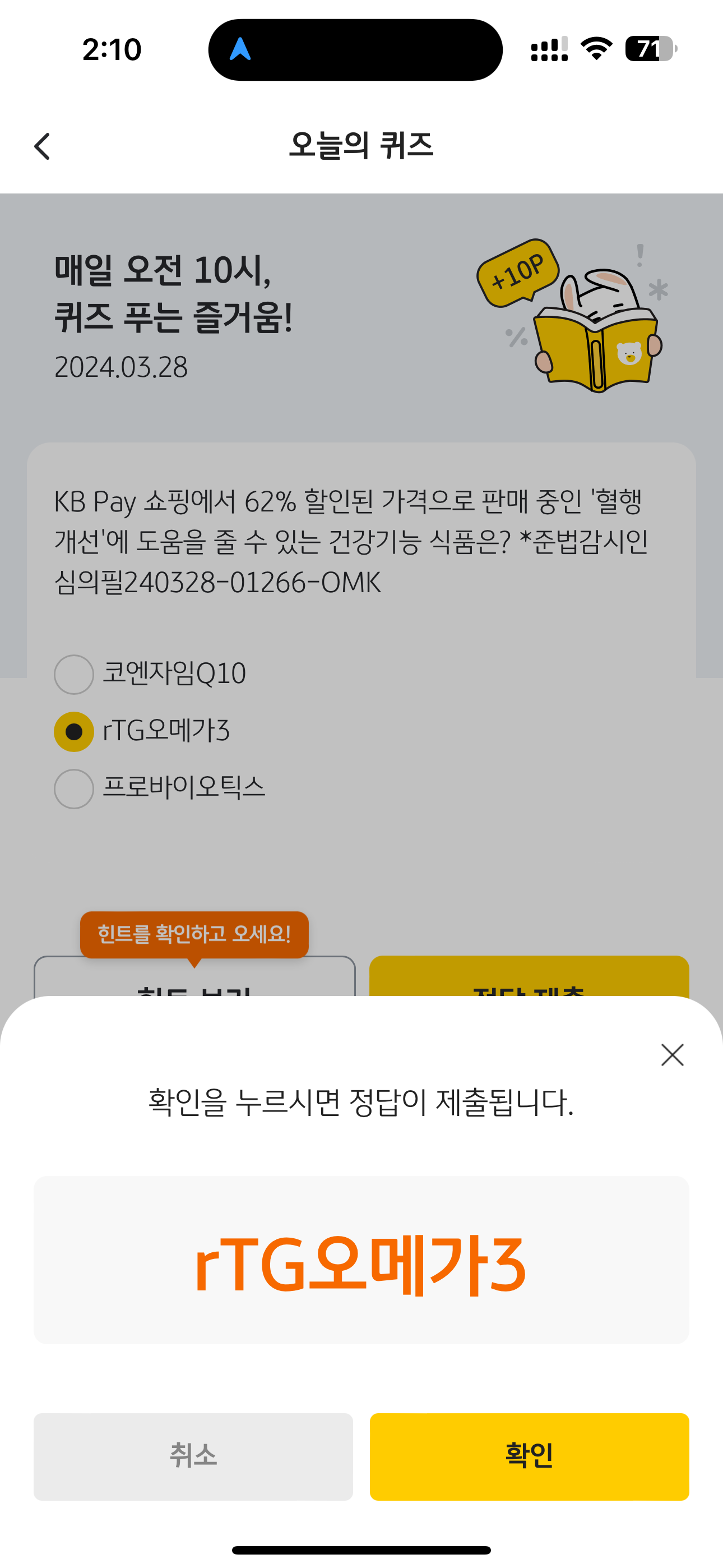 KB Pay 오늘의 퀴즈 정답은 rTG오메가3 입니다.