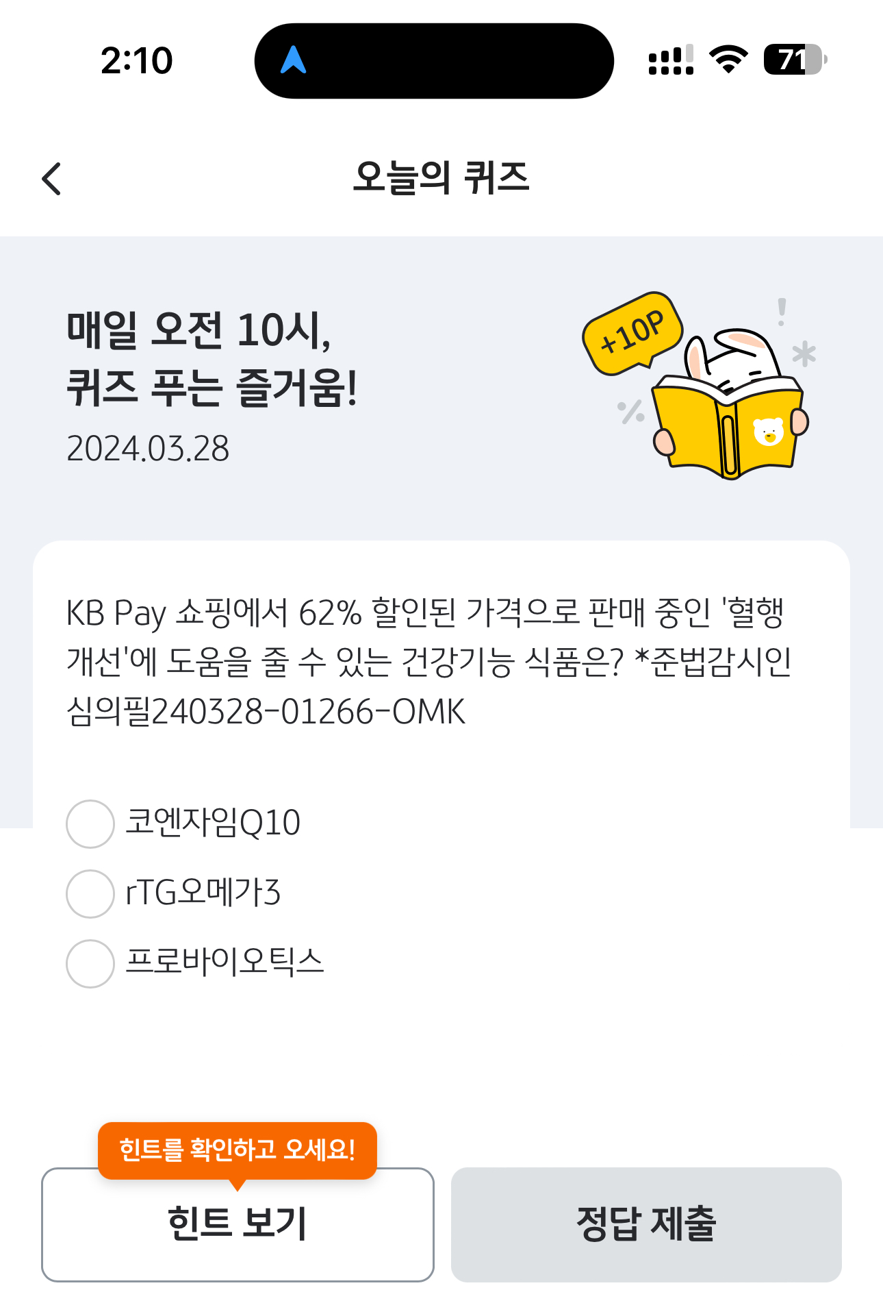 KB Pay 쇼핑에서 62% 할인된 가격으로 판매 중인 '혈행개선'에 도움을 줄 수 있는 건강기능 식품은? *준법감시인심의필240328-01266-OMK 보기는 1. 코엔자임Q10 2. rTG오케가3 3. 프로바이오틱스 입니다. 62% 특가 할인이니 필요하신 분은 참고하세요